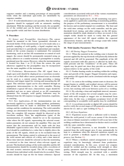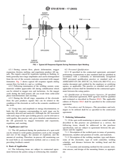 ASTM E751/E751M-17(2022) is a standard published by ASTM International. Its full title is "Standard Practice for Acoustic Emission Monitoring During Resistance Spot-Welding". This standard covers: SIGNIFICANCE AND USE 5.1 The AE produced during the production of a spot-weld can be related to weld quality parameters such as the strength and size of the nugget, the amount of expulsion, and the amount of cracking. Therefore, in-process AE monitoring can be used both as an examination method, and as a means for providing feedback control. SCOPE 1.1 This practice describes procedures for the measurement, processing, and interpretation of the acoustic emission (AE) response associated with selected stages of the resistance spot-welding process. 1.2 This practice also provides recommendations for feedback control by utilizing the measured AE response signals during the spot-welding process. 1.3 Units—The values stated in either SI units or inch-pound units are to be regarded separately as standard. The values stated in each system may not be exact equivalents; therefore, each system shall be used independently of the other. Combining values from the two systems may result in non-conformance with the standard. 1.4 This standard does not purport to address all of the safety concerns, if any, associated with its use. It is the responsibility of the user of this standard to establish appropriate safety, health, and environmental practices and determine the applicability of regulatory limitations prior to use. 1.5 This international standard was developed in accordance with internationally recognized principles on standardization established in the Decision on Principles for the Development of International Standards, Guides and Recommendations issued by the World Trade Organization Technical Barriers to Trade (TBT) Committee.