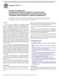 SIGNIFICANCE AND USE 5.1 The properties evaluated by this test method are intended to provide comparative information on the effects of fire-retardant chemical formulations and environmental conditions on the flexural properties and IB strength of FRSC panels. 5.2 This practice uses a controlled elevated-temperature environment to produce temperature-induced losses in the mechanical properties of FRSC panels and untreated panels. 5.3 Prediction of performance in natural environments has not been directly correlated with the results of this test method. 5.4 The reproducibility of results in elevated-temperature exposure is highly dependent on the type of specimens tested and the evaluation criteria selected, as well as the control of the operating variables. In any testing program, sufficient replicates shall be included to establish the variability of the results. Variability is often observed when similar specimens are tested in different chambers even though the testing conditions are nominally similar and within the ranges specified in this test method. SCOPE 1.1 This test method is designed as a laboratory screening test. It is intended to establish an understanding of the respective contributions of the many wood material, fire-retardant, resin and processing variables, and their interactions, upon the mechanical properties of fire-retarded mat-formed wood structural composite (FRSC) panels as they affect flexural and internal bond (IB) performance and as they are often affected later during exposure to high temperature and humidity. Once the critical material and processing variables have been identified through these small-specimen laboratory screening tests, additional testing and evaluation shall be required to determine the effect of the treatment on the panel structural properties and the effect of exposure to high temperature on the properties of commercially produced FRSC panels. In this test method, treated structural composite panels are exposed to a temperature of 77°C (170°F) and at least 50% relative humidity. 1.2 The purpose of the preliminary laboratory-based test method is to compare the flexural properties and IB strength of FRSC panels relative to untreated structural composite panels with otherwise identical manufacturing parameters. The results of tests conducted in accordance with this test method provide a reference point for estimating strength temperature relationships for preliminary purposes. They establish a starting point for subsequent full-scale testing of commercially produced FRSC panels. 1.3 This test method does not cover testing and evaluation requirements necessary for product certification and qualification or the establishment of design value adjustment factors for FRSC panels. Note 1: One potentially confounding limitation of this preliminary screening test method is that it may be conducted with laboratory panels that may not necessarily represent commercial quality panels. A final qualification program should likely be conducted using commercial quality panels and the scope of the review should include evaluation of the effects of the treatment and elevated temperature exposure on all relevant mechanical properties of the commercially produced panel. 1.4 This test method is not intended for use with structural plywood. 1.5 The values stated in SI units are to be regarded as standard. The values given in parentheses are mathematical conversions to inch-pound units that are provided for information only and are not considered standard. 1.6 This standard does not purport to address all of the safety concerns, if any, associated with its use. It is the responsibility of the user of this standard to establish appropriate safety and health practices and determine the applicability of regulatory limitations prior to use.