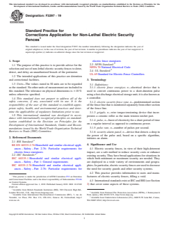 ASTM F3297-19 is a standard published by ASTM International. Its full title is "Standard Practice for Corrections Application for Non-Lethal Electric Security Fences". This standard covers: SIGNIFICANCE AND USE 4.1 Electric security fences, in view of their high-deterrent impact, are a safe method to reduce security costs or enhance existing security. They have broad applications for situations in which both minimum or maximum security are needed. They are deployed in a wide variety of environments and geographies. In particular, electric security fences are used to decrease the need for security guards and other security systems. 4.2 This practice provides information to users and manufacturers of electric security fences, filling a void. 4.3 International standards exist at IEC and BSI (see Section 2) that cover some aspects of these systems. 4.4 A standard issued by Underwriters Laboratories (UL) (UL 69) covers electric fence controllers to be used on lighting or line circuits in accordance with NFPA 70. However, UL 69 covers, specifically, electric fence controllers used only for the control of animals. Its requirements cover portable and permanently mounted electric fence controllers with peak-discharge or sinusoidal-discharge output for indoor or outdoor use, including battery operated controllers intended to operate from battery circuits of 42.4 V or less, line-operated controllers intended to operate from circuits of 125 V or less, combination controllers intended to operate from either a battery or a line circuit, and photovoltaic module battery operated controllers. The scope states that the requirements of UL 69 do not cover electric fence controllers for the continuous (uninterrupted) current type or intermediate equipment, such as a converter, a rectifier, or the like, that is sometimes used between the primary source of supply and an electric fence controller and is investigated only as part of a complete controller. UL 69 also states that the requirements do not cover electric fence controllers for use with electrified security fences. 4.5 In contrast to UL 69, this practice specifically addresses the use of electric security fences in detention ... SCOPE 1.1 The purpose of this practice is to provide advice for the selection and use of non-lethal electric security fences to deter, detect, and delay an unauthorized breach of the perimeter. 1.2 The intended applications of this practice are detention and correctional facilities. 1.3 Units—The values stated in SI units are to be regarded as the standard. No other units of measurement are included in this standard. The tolerance on physical dimensions is ±10 % unless otherwise specified. 1.4 This standard does not purport to address all of the safety concerns, if any, associated with its use. It is the responsibility of the user of this standard to establish appropriate safety, health, and environmental practices and determine the applicability of regulatory limitations prior to use. 1.5 This international standard was developed in accordance with internationally recognized principles on standardization established in the Decision on Principles for the Development of International Standards, Guides and Recommendations issued by the World Trade Organization Technical Barriers to Trade (TBT) Committee.