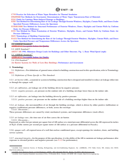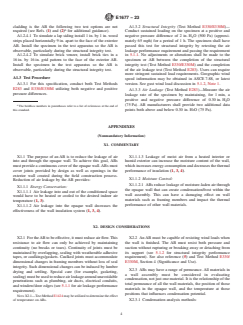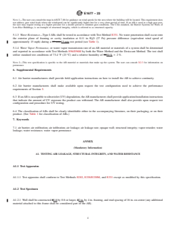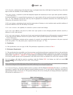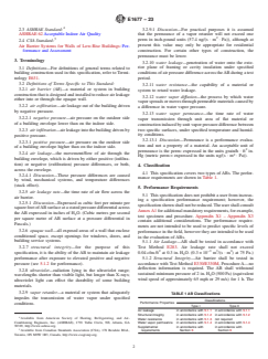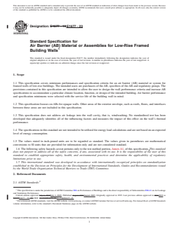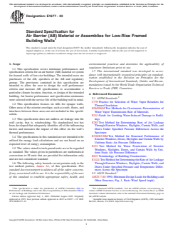ABSTRACT This specification covers the minimum performance and acceptance criteria for an air barrier (AB) material or system for framed walls of low-rise buildings with the service life of the building wall in mind. The provisions contained in this specification are intended to allow the user to design the wall performance criteria and increase AB specifications to accommodate a particular climate location, function, or design of the intended building. This specification focuses mainly on ABs for opaque walls. Other areas of the exterior envelope, such as roofs, floors, and interfaces between these areas are not included in this specification. Also not addressed here are air leakages into the wall cavity, that is, windwashing. Additionally, the specifications in this standard are not intended to be utilized for energy load calculations and are not based on an expected level of energy consumption. SCOPE 1.1 This specification covers minimum performances and specification criteria for an air barrier (AB) material or system for framed walls of low-rise buildings. The intended users are purchasers of the AB, specifiers of the AB and regulatory groups. The provisions contained in this specification are intended to allow the user to design the wall performance criteria and increase AB specifications to accommodate a particular climate location, function, or design of the intended building. Air barrier performance and specification minimums were selected with the service life of the building wall in mind. 1.2 This specification focuses on ABs for opaque walls. Other areas of the exterior envelope, such as roofs, floors, and interfaces between these areas are not included in this specification. 1.3 This specification does not address air leakage into the wall cavity, that is, windwashing. No standardized test has been developed that adequately identifies all of the influencing factors and measures the impact of this effect on the wall's thermal performance. 1.4 The specifications in this standard are not intended to be utilized for energy load calculations and are not based on an expected level of energy consumption. 1.5 The values stated in inch-pound units are to be regarded as standard. The values given in parentheses are mathematical conversions to SI units that are provided for information only and are not considered standard. 1.6 The following safety hazards caveat pertains only to the test method portion, Annex A1, of this specification. This standard does not purport to address all of the safety concerns, if any, associated with its use. It is the responsibility of the user of this standard to establish appropriate safety, health, and environmental practices and determine the applicability of regulatory limitations prior to use. 1.7 This international standard was developed in accordance with internationally recognized principles on standardization established in the Decision on Principles for the Development of International Standards, Guides and Recommendations issued by the World Trade Organization Technical Barriers to Trade (TBT) Committee.