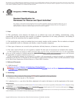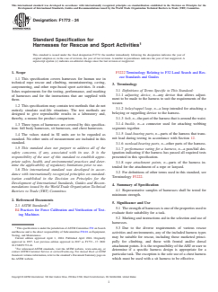 ASTM F1772-24 is a technical specification published by ASTM International. Its full title is "Standard Specification for Harnesses for Rescue and Sport Activities". This standard covers: ABSTRACT This specification covers the tests and corresponding performance and design requirements for climbing harnesses used in the sports of rock, ice, and snow climbing. Three types of harnesses are covered by this specification: full body harnesses, sit harnesses, and chest harnesses. Representative samples of harnesses shall be tested for minimum strength to evaluate their suitability for use in climbing. SCOPE 1.1 This specification covers harnesses for human use in technical rope rescue and climbing, mountaineering, caving, canyoneering, and other rope-based sport activities. It establishes requirements for the testing, performance, and marking of harnesses and for the instructions that are supplied with them. 1.2 This specification may contain test methods that do not entirely simulate real-life situations. The test methods are designed to give reproducible results in a laboratory and, thereby, a means for product comparison. 1.3 Three types of harnesses are covered by this specification: full body harnesses, sit harnesses, and chest harnesses. 1.4 The values stated in SI units are to be regarded as standard. No other units of measurement are included in this standard. 1.5 This standard does not purport to address all of the safety concerns, if any, associated with its use. It is the responsibility of the user of this standard to establish appropriate safety, health, and environmental practices and determine the applicability of regulatory limitations prior to use. 1.6 This international standard was developed in accordance with internationally recognized principles on standardization established in the Decision on Principles for the Development of International Standards, Guides and Recommendations issued by the World Trade Organization Technical Barriers to Trade (TBT) Committee.