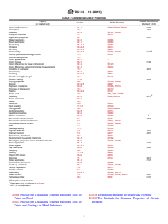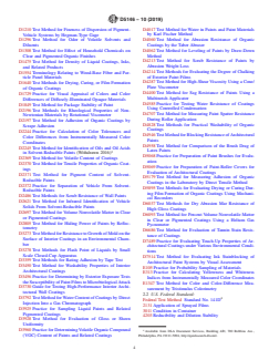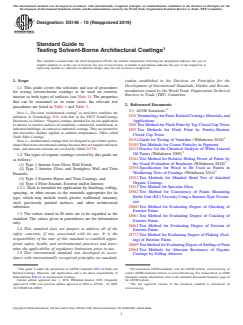 ABSTRACT This guide covers the selection and use of procedures for testing solvent-borne architectural coatings to be used on exterior, interior, or both types of surfaces. The properties that can be examined by the test methods listed herein are as follows: liquid paint properties (skinning, condition in container, coarse particles and foreign matter, density or weight per gallon, fineness of dispersion, flash point, odor, absorption, colorant acceptance, dilution stability, package stability, heat stability, and settling); coating application and film formation characteristics (brush application properties, brush drag, roller application properties, roller spatter, spray application properties, touch-up uniformity, consistency (low-shear viscosity), rheological properties of non-Newtonian liquids, sag resistance, levelling properties, and drying properties); appearance of dry film (color appearance, color differences by visual comparison, color differences using instrumental measurements, directional reflectance, gloss, sheen, hiding power, and yellowness index); properties of dry film (abrasion resistance, adhesion, flexibility, resistance to household chemicals, color change of white enamels, washability and cleansability, blister resistance, exposure resistance, chalking, checking, cracking, erosion, flaking, mildew resistance, and fume resistance); and Coating Analysis (chemical analysis, volatile content, nonvolatile volume content, water content, pigment content, pigment analysis, nonvolatile vehicle content, vehicle separation, and nonvolatile vehicle identification). SCOPE 1.1 This guide covers the selection and use of procedures for testing solvent-borne coatings to be used on exterior, interior or both types of surfaces (see Note 1). The properties that can be examined or, in some cases, the relevant test procedures are listed in Table 1 and Table 2. Note 1: The term “architectural coating” as used here combines the definition in Terminology D16 with that in the FSCT Paint/Coatings Dictionary, as follows: “Organic coatings intended for on-site application to interior or exterior surfaces of residential, commercial, institutional, or industrial buildings, in contrast to industrial coatings. They are protective and decorative finishes applied at ambient temperatures. Often called Trade Sales Coatings.” Note 2: Architectural coatings that are designed to give better performance than most conventional coatings because they are tougher and more stain- and abrasion-resistant are covered by Guide D3730. 1.2 The types of organic coatings covered by this guide are as follows: (1) Type 1 Interior Low-Gloss Wall Finish, (2) Type 2 Interior Gloss and Semigloss Wall and Trim Enamels, (3) Type 3 Exterior House and Trim Coatings, and (4) Type 4 Floor Enamel, Exterior and/or Interior. 1.2.1 Each is intended for application by brushing, rolling, spraying, or other means to the materials appropriate for its type, which may include wood, plaster, wallboard, masonry, steel, previously painted surfaces, and other architectural substrates. 1.3 The values stated in SI units are to be regarded as the standard. The values given in parentheses are for information only. 1.4 This standard does not purport to address all of the safety concerns, if any, associated with its use. It is the responsibility of the user of this standard to establish appropriate safety, health, and environmental practices and determine the applicability of regulatory limitations prior to use. 1.5 This international standard was developed in accordance with internationally recognized principles on standardization established in the Decision on Principles for the Development of International Standards, Guides and Recommendations issued by the World Trade Organization Technical Barriers to Trade (TBT) Committee.