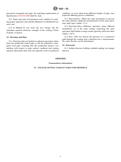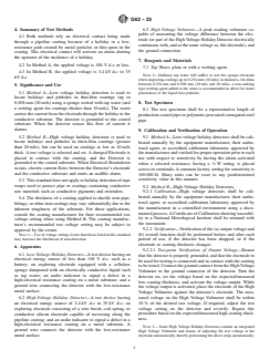 SIGNIFICANCE AND USE 5.1 Method A—Low voltage holiday detection is used to locate holidays and pinholes in thin-film coatings (up to 0.508 mm (20 mils) using a sponge wetted with tap water (and a wetting agent for coatings thicker than 10 mils). The water carries the current from the electrode through the holiday to the conductive substrate. The detector is grounded to the coated substrate. When the detector senses this flow of current it alarms. 5.2 Method B—High voltage holiday detection is used to locate holidays and pinholes in thick-film coatings (greater than 20 mils), but can be used on coatings as low as 10 mils thick. A test voltage is selected and set. A charged Electrode is placed in contact with the coating, and the Detector is grounded to the coated substrate. When Electrical Breakdown occurs, electric current flows between the Detector’s electrode and the conductive substrate and emits an audible alarm. 5.3 This standard does not apply to holiday detection of tape wraps used to protect pipe or coatings containing conductive raw materials such as conductive pigments and extenders. 5.4 The thickness of a coating applied to ductile iron pipe, fittings, or other iron castings may vary substantially due to the inherent roughness of the substrate. For these applications, consult the coating manufacturer for their recommended test voltage setting when using Method B. The coating manufacturer’s recommended test voltage setting may be subject to approval by the owner. Note 1: Use of voltage settings lower than those listed in this standard may increase the likelihood of non-detection. SCOPE 1.1 These test methods cover the apparatus and procedures for detecting pinholes and holidays in coatings used to protect pipelines. 1.2 Method A is designed to detect pinholes and holidays in thin-film coatings from 0.025 mm to 0.254 mm (1 mils to 10 mils) in thickness using ordinary tap water and an applied voltage of less than 100 V d-c. It is effective on films up to 0.508 mm (20 mils) thickness if a wetting agent is used with the water. 1.3 Method B is designed to detect pinholes and holidays in thick-film coatings >0.508 mm (20 mils) This method can be used on any thickness of pipeline coating and utilizes applied voltages between 3.4 and 35 kV d-c. 1.4 The values stated in SI units to three significant decimals are to be regarded as the standard. The values given in parentheses are for information only. 1.5 This standard does not purport to address all of the safety concerns, if any, associated with its use. It is the responsibility of the user of this standard to establish appropriate safety, health, and environmental practices and determine the applicability of regulatory limitations prior to use. 1.6 This international standard was developed in accordance with internationally recognized principles on standardization established in the Decision on Principles for the Development of International Standards, Guides and Recommendations issued by the World Trade Organization Technical Barriers to Trade (TBT) Committee.