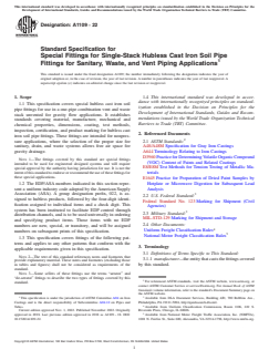 ASTM A1109-22 is a technical specification published by ASTM International. Its full title is "Standard Specification for Special Fittings for Single-Stack Hubless Cast Iron Soil Pipe Fittings for Sanitary, Waste, and Vent Piping Applications". This standard covers: ABSTRACT This specification covers the materials, manufacturing practice, and corresponding test methods for special hubless cast iron soil pipe fittings used in a one-pipe combination vent and waste stack unvented for gravity flow applications. These fittings are intended for nonpressure applications, where the selection of the proper size for sanitary, drain, and waste systems allows free air space for gravity drainage. The fittings shall be iron castings suitable for installation and service for sanitary, storm drain, and waste vent piping applications. The castings shall be made of cast iron, produced by an established commercial method that provides control over chemical and mechanical properties. This specification also covers dimensions, coating, mechanical and chemical tests for gray iron, methods of specifying fittings, sampling, inspection, certification, packaging and package marking, and product marking for hubless cast iron soil pipe fittings. SCOPE 1.1 This specification covers special hubless cast iron soil pipe fittings for use in a one-pipe combination vent and waste stack unvented for gravity flow applications. It establishes standards covering material, manufacture, mechanical and chemical properties, dimensions, coating, test methods, inspection, certification, and product marking for hubless cast iron soil pipe fittings. These fittings are intended for nonpressure applications, where the selection of the proper size for sanitary, drain, and waste systems allows free air space for gravity drainage. Note 1: The fittings covered by this standard are special fittings intended to be used for engineered designed systems and will require special approval by the authority having jurisdiction for use. It is not the intent of this standard to endorse or recommend the use of these fittings for these special applications. 1.2 The EDP/ASA numbers indicated in this section represent a uniform industry code adopted by the American Supply Association (ASA). A group designation prefix, 022, is assigned to hubless products, followed by the four-digit identification assigned to individual items and a check digit. This system has been instituted to facilitate EDP control through distribution channels, and is to be used universally in ordering and specifying product items. Those items with no EDP numbers are new, special, or transitory, and will be assigned numbers on subsequent prints of this specification. 1.3 This specification covers fittings of the following patterns and applies to any other patterns that conform with the applicable requirements given in this specification. Note 2: The text of this standard references notes and footnotes that provide explanatory material. These notes and footnotes (excluding those in tables and figures) shall not be considered as requirements of the standard. Note 3: Some sellers of these fittings use the terms “aerator” and “de-aerator” fittings to describe the two types of fittings covered by this standard. 1.4 This international standard was developed in accordance with internationally recognized principles on standardization established in the Decision on Principles for the Development of International Standards, Guides and Recommendations issued by the World Trade Organization Technical Barriers to Trade (TBT) Committee.
