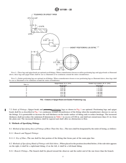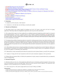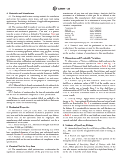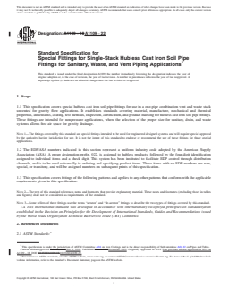 ABSTRACT This specification covers the materials, manufacturing practice, and corresponding test methods for special hubless cast iron soil pipe fittings used in a one-pipe combination vent and waste stack unvented for gravity flow applications. These fittings are intended for nonpressure applications, where the selection of the proper size for sanitary, drain, and waste systems allows free air space for gravity drainage. The fittings shall be iron castings suitable for installation and service for sanitary, storm drain, and waste vent piping applications. The castings shall be made of cast iron, produced by an established commercial method that provides control over chemical and mechanical properties. This specification also covers dimensions, coating, mechanical and chemical tests for gray iron, methods of specifying fittings, sampling, inspection, certification, packaging and package marking, and product marking for hubless cast iron soil pipe fittings. SCOPE 1.1 This specification covers special hubless cast iron soil pipe fittings for use in a one-pipe combination vent and waste stack unvented for gravity flow applications. It establishes standards covering material, manufacture, mechanical and chemical properties, dimensions, coating, test methods, inspection, certification, and product marking for hubless cast iron soil pipe fittings. These fittings are intended for nonpressure applications, where the selection of the proper size for sanitary, drain, and waste systems allows free air space for gravity drainage. Note 1: The fittings covered by this standard are special fittings intended to be used for engineered designed systems and will require special approval by the authority having jurisdiction for use. It is not the intent of this standard to endorse or recommend the use of these fittings for these special applications. 1.2 The EDP/ASA numbers indicated in this section represent a uniform industry code adopted by the American Supply Association (ASA). A group designation prefix, 022, is assigned to hubless products, followed by the four-digit identification assigned to individual items and a check digit. This system has been instituted to facilitate EDP control through distribution channels, and is to be used universally in ordering and specifying product items. Those items with no EDP numbers are new, special, or transitory, and will be assigned numbers on subsequent prints of this specification. 1.3 This specification covers fittings of the following patterns and applies to any other patterns that conform with the applicable requirements given in this specification. Note 2: The text of this standard references notes and footnotes that provide explanatory material. These notes and footnotes (excluding those in tables and figures) shall not be considered as requirements of the standard. Note 3: Some sellers of these fittings use the terms “aerator” and “de-aerator” fittings to describe the two types of fittings covered by this standard. 1.4 This international standard was developed in accordance with internationally recognized principles on standardization established in the Decision on Principles for the Development of International Standards, Guides and Recommendations issued by the World Trade Organization Technical Barriers to Trade (TBT) Committee.