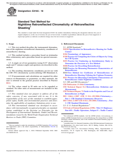 ASTM E3165-18 is a standard published by ASTM International. Its full title is "Standard Test Method for Nighttime Retroreflected Chromaticity of Retroreflective Sheeting". This standard covers: SIGNIFICANCE AND USE 5.1 The results of this test method are used to assess conformance of retroreflective sheeting to the nighttime color requirements of industry standards and government regulations, such as Specification D4956 and U.S. Code of Federal Regulations Title 23 Part 655 Subpart F. 5.2 Requirements in specifications referring to this test method are for the chromaticity of the material as viewed at night. These requirements are generally stated using four or five corner points that form a box that limits the range of acceptable chromaticity. Most of these specifications are categorical in nature; they describe a small range of colors that are recognizable from a color naming or coding purpose 5.3 The method for compliance with the specification is to plot the measured (x, y) values and determine if the measured point falls within the specification box for the color of interest. SCOPE 1.1 This test method describes the instrumental determination of the nighttime retroreflected chromaticity coordinates of retroreflective sheeting. 1.2 This method includes a procedure based on tristimulus filter colorimetery and a procedure based on spectral measurements. 1.3 A single set of test geometries (using 0.33° observation angle and 5° entrance angle) and apertures are described in this method. 1.4 The resulting chromaticity coordinates are for use with the CIE 1931 chromaticity system utilizing CIE Illuminant A. 1.5 If measurements and calculations are required for other sources of illumination, or geometries, or other materials, the user is referred to the general practice described in Practice E811. 1.6 The values stated in SI units are to be regarded as standard. No other units of measurement are included in this standard. 1.7 This standard does not purport to address all of the safety concerns, if any, associated with its use. It is the responsibility of the user of this standard to establish appropriate safety, health, and environmental practices and determine the applicability of regulatory limitations prior to use. 1.8 This international standard was developed in accordance with internationally recognized principles on standardization established in the Decision on Principles for the Development of International Standards, Guides and Recommendations issued by the World Trade Organization Technical Barriers to Trade (TBT) Committee.