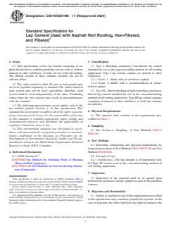 ASTM D3019/D3019M-17(2024) is a technical specification published by ASTM International. Its full title is "Standard Specification for Lap Cement Used with Asphalt Roll Roofing, Non-Fibered, and Fibered". This standard covers: ABSTRACT This specification covers the physical requirements and testing of three types of lap cement for use with asphalt roll roofing. Type I is a brushing consistency lap cement intended for use in the exposed-nailing method of roll roofing application, and contains no mineral or other stabilizers. This type is further divided into two grades, as follows: Grade 1, which is made with an air-blown asphalt; and Grade 2, which is made with a vacuum-reduced or steam-refined asphalt. Both Types II and III, on the other hand, are heavy brushing or light troweling consistency lap cement intended for use in the concealed-nailing method of roll roofing application, only that Type II cement contains a quantity of short-fibered asbestos, while Type III cement contains a quantity of mineral or other stabilizers, or both, but contains no asbestos. The lap cements shall be sampled for testing, and shall adhere to specified values of the following properties: water content; distillation (total distillate at given temperatures); softening point of residue; solubility in trichloroethylene; and strength at indicated age. SCOPE 1.1 This specification covers lap cement consisting of asphalt dissolved in a volatile petroleum solvent with or without mineral or other stabilizers, or both, for use with roll roofing. The fibered version of these cements excludes the use of asbestos fibers. 1.2 The values stated in either SI units or inch-pound units are to be regarded separately as standard. The values stated in each system may not be exact equivalents; therefore, each system shall be used independently of the other. Combining values from the two systems may result in nonconformance with the standard. 1.3 The following precautionary caveat applies only to the test method portion, Section 6, of this specification: This standard does not purport to address all of the safety concerns, if any, associated with its use. It is the responsibility of the user of this standard to establish appropriate safety, health, and environmental practices and determine the applicability of regulatory limitations prior to use. 1.4 This international standard was developed in accordance with internationally recognized principles on standardization established in the Decision on Principles for the Development of International Standards, Guides and Recommendations issued by the World Trade Organization Technical Barriers to Trade (TBT) Committee.