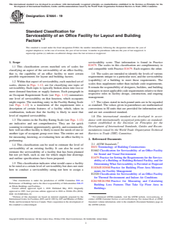 ASTM E1664-19: Standard Classification for Serviceability of an Office Facility for Layout and Building Factors provides a framework for categorizing the serviceability of office facilities, specifically focusing on how well a building meets functional requirements related to layout and key building features. Developed by ASTM International, this classification enables users to estimate and compare levels of serviceability across existing, planned, or remodeled office spaces, promoting informed decisions during design, renovation, and facility management processes.
