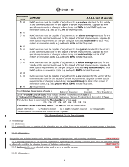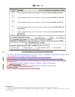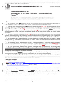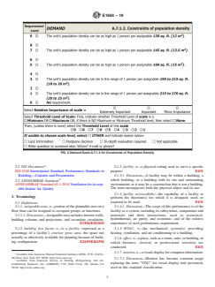 SIGNIFICANCE AND USE 4.1 Each Facility Rating Scale (see Figs. 1-12) in this classification provides a means to estimate the level of serviceability of a building or facility for one topic of serviceability and to compare that level against the level of any other building or facility. 4.2 This classification can be used for comparing how well different buildings or facilities meet a particular requirement for serviceability. It is applicable despite differences such as location, structure, mechanical systems, age, and building shape. 4.3 This classification can be used to estimate the amount of variance of serviceability from target or from requirement, for a single office facility or within a group of office facilities. 4.4 This classification can be used to estimate the following: 4.4.1 Serviceability of an existing facility for uses other than its present use. 4.4.2 Serviceability (potential) of a facility that has been planned but not yet built. 4.4.3 Serviceability (potential) of a facility for which remodeling has been planned. 4.5 Use of this classification does not result in building evaluation or diagnosis. Building evaluation or diagnosis generally requires a special expertise in building engineering or technology and the use of instruments, tools, or measurements. 4.6 This classification applies only to facilities that are building constructions, or parts thereof. (While this classification may be useful in rating the serviceability of facilities that are not building constructions, such facilities are outside the scope of this classification.) 4.7 This classification is not intended for, and is not suitable for, use for regulatory purposes, nor for fire hazard assessment nor for fire risk assessment. SCOPE 1.1 This classification covers matched sets of scales for classifying an aspect of the serviceability of an office facility, that is, the capability of an office facility to meet certain possible requirements for layout and building factors. 1.2 Within that aspect of serviceability, each matched set of scales, shown in Figs. 1-12, are for classifying one topic of serviceability. Each topic is typically broken down into two or more demand functions or supply features. Each paragraph in an Occupant Requirement Scale (see Figs. 1-12) summarizes one level of serviceability on that function, which occupants might require. The matching entry in the Facility Rating Scale (see Figs. 1-12) is a translation of the requirement into a description of certain features of a facility which, taken in combination, indicate that the facility is likely to meet that level of required serviceability. FIG. 1 Demand Scale A.7.1.1 for Constraints on Layout FIG. 2 Demand Scale A.7.1.2 for Constraints of Population Density FIG. 3 Demand Scale A.7.1.3 for Cost of Upgrade FIG. 4 Supply Scale A.7.1.1 for Constraints on Layout FIG. 5 Supply Scale A.7.1.2 for Population Density Supported FIG. 6 Supply Scale A.7.1.3 for Cost of Upgrade FIG. 7 Demand Scale A.7.2.1 for Tolerance of Sound and Visual Conditions FIG. 8 Demand Scale A.7.2.2 Avoiding Glare on Monitors FIG. 9 Supply Scale A.7.2.1 Constraints on Layout FIG. 10 Supply Scale A.7.2.2 Avoiding Glare on Monitors FIG. 11 Demand Scale A.7.3 for Influence of Building Loss Features on Space Needs FIG. 12 Supply Scale A.7.3 Influence of Building Loss Features on Space Needs 1.3 The entries in the Facility Rating Scale (see Figs. 1-12) are indicative and not comprehensive. They are for quick scanning to estimate approximately, quickly, and economically, how well an office facility is likely to meet the needs of one or another type of occupant group over time. The entries are not for measuring, knowing, or evaluating how an office facility is performing. 1.4 This classification can be used to estimate the level of serviceability of an existing facility. It can also be used to estimate the serviceability of a facil...