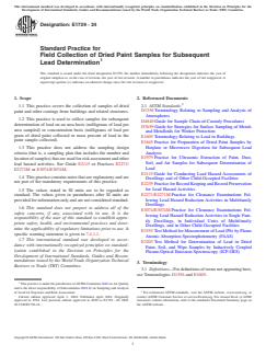 ASTM E1729-24 is a standard published by ASTM International. Its full title is "Standard Practice for Field Collection of Dried Paint Samples for Subsequent Lead Determination". This standard covers: SIGNIFICANCE AND USE 5.1 Although this practice is intended for the collection of dried paint samples in and around buildings and related structures for the subsequent determination of lead content, this practice may also be used to collect paint samples from other structures for lead analysis.3 5.2 The variability associated with the sampling of dried paint is generally considered to be far higher than the variability associated with the analyses of the paint specimens. Therefore, it is essential that sample collection be properly controlled to produce representative and meaningful samples. 5.3 These samples are collected in a manner that will permit subsequent digestion using sample preparation techniques such as Practices E1645 or E1979 and determination of lead using laboratory analysis techniques such as inductively coupled plasma atomic emission spectrometry (ICP-AES) (see Test Method E3203) or flame atomic absorption spectrometry (FAAS) (see Test Method E3193). SCOPE 1.1 This practice covers the collection of samples of dried paint and other coatings from buildings and related structures. 1.2 This practice is used to collect samples for subsequent determination of lead on an area basis (milligrams of lead per area sampled) or concentration basis (milligrams of lead per gram of dried paint collected or mass percent of lead in the paint sample collected). 1.3 This practice does not address the sampling design criteria (that is, a sampling plan that includes the number and location of samples) that are used for risk assessment and other lead hazard activities. See Guide E2115 or Practices E2271/E2271M or E3074/E3074M. 1.4 This practice contains notes that are explanatory and are not part of the mandatory requirements of this practice. 1.5 The values stated in SI units are to be regarded as standard. The values given in parentheses after SI units are provided for information only and are not considered standard. 1.6 This standard does not purport to address all of the safety concerns, if any, associated with its use. It is the responsibility of the user of this standard to establish appropriate safety, health, and environmental practices and determine the applicability of regulatory limitations prior to use. A specific warning statement is given in 7.4.1.1. 1.7 This international standard was developed in accordance with internationally recognized principles on standardization established in the Decision on Principles for the Development of International Standards, Guides and Recommendations issued by the World Trade Organization Technical Barriers to Trade (TBT) Committee.