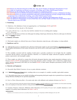 SIGNIFICANCE AND USE 5.1 Although this practice is intended for the collection of dried paint samples in and around buildings and related structures for the subsequent determination of lead content, this practice may also be used to collect paint samples from other structures for lead analysis.3 5.2 The variability associated with the sampling of dried paint is generally considered to be far higher than the variability associated with the analyses of the paint specimens. Therefore, it is essential that sample collection be properly controlled to produce representative and meaningful samples. 5.3 These samples are collected in a manner that will permit subsequent digestion using sample preparation techniques such as Practices E1645 or E1979 and determination of lead using laboratory analysis techniques such as inductively coupled plasma atomic emission spectrometry (ICP-AES) (see Test Method E3203) or flame atomic absorption spectrometry (FAAS) (see Test Method E3193). SCOPE 1.1 This practice covers the collection of samples of dried paint and other coatings from buildings and related structures. 1.2 This practice is used to collect samples for subsequent determination of lead on an area basis (milligrams of lead per area sampled) or concentration basis (milligrams of lead per gram of dried paint collected or mass percent of lead in the paint sample collected). 1.3 This practice does not address the sampling design criteria (that is, a sampling plan that includes the number and location of samples) that are used for risk assessment and other lead hazard activities. See Guide E2115 or Practices E2271/E2271M or E3074/E3074M. 1.4 This practice contains notes that are explanatory and are not part of the mandatory requirements of this practice. 1.5 The values stated in SI units are to be regarded as standard. The values given in parentheses after SI units are provided for information only and are not considered standard. 1.6 This standard does not purport to address all of the safety concerns, if any, associated with its use. It is the responsibility of the user of this standard to establish appropriate safety, health, and environmental practices and determine the applicability of regulatory limitations prior to use. A specific warning statement is given in 7.4.1.1. 1.7 This international standard was developed in accordance with internationally recognized principles on standardization established in the Decision on Principles for the Development of International Standards, Guides and Recommendations issued by the World Trade Organization Technical Barriers to Trade (TBT) Committee.
