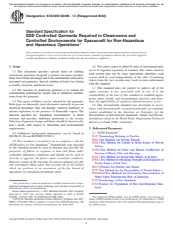 ASTM E1549/E1549M-13(2022) - Standard Specification for ESD Controlled Garments Required in Cleanrooms and Controlled Environments for Spacecraft for Non-Hazardous and Hazardous Operations outlines requirements for garments that control electrostatic discharge (ESD) and contamination in aerospace cleanrooms and controlled environments. Issued by ASTM International, this standard is essential for organizations handling spacecraft assembly and maintenance, where sensitive hardware and extremely clean environments are critical. The standard emphasizes the use of specialized clothing to safeguard both products and personnel against hazards from static electricity, particles, and flammable environments.