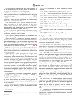 SIGNIFICANCE AND USE 4.1 This guide outlines various techniques for evaluating and mitigating the impacts of climate change and weather extremes on remediation systems, activity and use limitations, stewardship and remediation activities. 4.2 Users include: local, state, federal, tribal, and international agencies; the military; environmental consultants; developers; financial institutions; non-governmental organizations; environmental advocacy groups; commercial businesses, industries, and the interested public. 4.3 A 2018 ITRC survey of 45 state environmental agencies found key Best Management Practices (BMPs) and adaptation strategies for resilient cleanup. These include remedy infrastructure and disaster planning for chemical releases as an important part of the state’s clean-up program. In some cases, such considerations are now required by state regulations and included in policy and guidance (ITRC, 2018 (3)). 4.4 Adaptation is important because it is about considering and addressing the changing frequency and intensity of extreme events. Adaptation differs from resiliency by anticipating, planning and preparing for impacts under both current and future climate conditions. 4.5 There are many models and different strategies on adapting to climate and weather extremes, including those in the European Union (European Union, 2013 (4), IPPC, 2001 (5)). 4.6 The USGAO has reported benefits from evaluating climate risks for large projects. (USGAO, 2019 (6)) GAO found most Superfund sites have not factored the increasing frequency and severity of extreme weather events and climate impacts into the design of remedies. This has resulted in unplanned releases of chemicals into the environment at some sites. 4.7 Companies and organizations operating in accordance with ISO 14001-2015 may find this guide useful for meeting the long-term compliance obligation requirements of Clause 5.2 (ISO 14001-2015) 4.8 This guide should be integrated into the fundamentals of an organizati... SCOPE 1.1 The potential for increasing climate and extreme weather impacts requires more attention be given to their effect on sites where chemicals have been released. All stages of remediation planning and implementation should consider and address potential climate and extreme weather impacts, such as flooding and wildfires, that may affect remedy sustainability, continued protection of human and ecological receptors, the surrounding community, and the environment. Both resiliency to current extreme weather impacts as well as adaptation to longer-term impacts due to the changing climate should be considered. Consideration of climate and extreme weather impacts during stabilization, remedial investigation, feasibility studies, remedial design, remedial action implementation, long-term operations and management, and site stewardship may lead to the use of innovative technologies and more robust remediation strategies. 1.2 The conceptual site model is designed to inform all aspects of site decision making, inclusive of the investigation, feasibility study, design and implementation. It may be the most important mechanism to integrate consideration of climate impacts. The conceptual site model should be continuously developed and refined, while considering new knowledge about climate factors and potential impacts to the site. 1.3 This ASTM resiliency guide identifies the best management practices for incorporating resiliency and vulnerability assessment into all stages of the site cleanup process. Historically, resiliency was primarily considered or contemplated in the final stages of the cleanup process, such as in the operation and maintenance stage, after a remedy was completely in place at a site. Gradually, resiliency has extended to earlier stages of the cleanup process. This may include initial vulnerability assessment for site stabilization and extending into the remedial investigation and feasibility stage. This ...