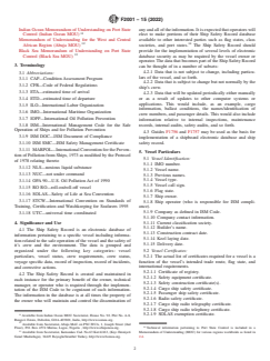 ABSTRACT This guide provides a uniform format and definition of general vessel-related technical information, including ship safety data, to be used by ship owners and operators, at their option and to the extent that they consider beneficial to their operation. It is recognized that all of the data is already contained in various documents on the vessel, but normally not electronically and normally not in one location. The ship safety record is designed to provide an industry-accepted common method of identifying, maintaining, and subsequently communicating the safety-related information needed for maritime operations. The ship safety record is an electronic database of information pertaining to a specific vessel including information related to the safe operation of the vessel and the safety of its crew and the environment. The vessel particulars, vessel status, crew requirements, status of crew and persons other than passengers on board, voyage specific data, record of inspection, record of incidents and corrective actions are presented in details. SIGNIFICANCE AND USE 4.1 The Ship Safety Record is an electronic database of information pertaining to a specific vessel including information related to the safe operation of the vessel and the safety of it’s crew and the environment. The data is grouped and organized under the following key categories: vessel particulars, vessel status, crew requirements, crew status, voyage specific data, record of inspection, record of incidents, and corrective actions. 4.2 The Ship Safety Record is created and maintained in each instance for the primary benefit of the owner, technical manager, or operator who is required through the implementation of the ISM Code to be cognizant of such information. The information in the database is at all times the property of the owner who will maintain and control the dissemination of any and all of the information. It is expected that operators will elect to make portions of their Ship Safety Record database available to other interested parties such as flag states, class societies, and port states.14 The Ship Safety Record should provide for the implementation of several levels of electronic database security as may be required by the vessel owner or operator. The data that becomes part of the Ship Safety Record can be thought of in a number of subsets: 4.2.1 Data that is not subject to change, including particulars of the vessel, and so forth. 4.2.2 Data that is subject to change but not normally by the ship’s crew. 4.2.3 Data that will be updated periodically either manually or as a result of updates to other computer systems or applications. This would include, as an example, cargo information, ballast conditions, the names/identification of crew members, and passenger details. This would also include information relative to internal inspections, maintenance records, internal audits, safety audits, and so forth. 4.3 Guides F1756 and F1757 may be used as the basis for implementation of a shipboard electronic database and ship safety record. SCOPE 1.1 This guide provides a uniform format and definition of general vessel-related technical information, including ship safety data, to be used by ship owners and operators, at their option and to the extent that they consider beneficial to their operation. It is recognized that all of the data is already contained in various documents on the vessel, but normally not electronically and normally not in one location. The Ship Safety Record is designed to provide an industry-accepted common method of identifying, maintaining, and subsequently communicating the safety-related information needed for maritime operations. It is recognized that many of the data fields are not applicable for every vessel. Appendix X1 and Appendix X2 provide examples of how data elements in this guide may be used for a specific purpose, that is, the USCG’s Automated Identification System (AIS) and the...