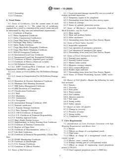 ASTM F2001-15(2022) is a guide published by ASTM International. Its full title is "Standard Guide for Vessel-Related Technical Information for Use in Developing an Electronic Database and Ship Safety Record". This standard covers: ABSTRACT This guide provides a uniform format and definition of general vessel-related technical information, including ship safety data, to be used by ship owners and operators, at their option and to the extent that they consider beneficial to their operation. It is recognized that all of the data is already contained in various documents on the vessel, but normally not electronically and normally not in one location. The ship safety record is designed to provide an industry-accepted common method of identifying, maintaining, and subsequently communicating the safety-related information needed for maritime operations. The ship safety record is an electronic database of information pertaining to a specific vessel including information related to the safe operation of the vessel and the safety of its crew and the environment. The vessel particulars, vessel status, crew requirements, status of crew and persons other than passengers on board, voyage specific data, record of inspection, record of incidents and corrective actions are presented in details. SIGNIFICANCE AND USE 4.1 The Ship Safety Record is an electronic database of information pertaining to a specific vessel including information related to the safe operation of the vessel and the safety of it’s crew and the environment. The data is grouped and organized under the following key categories: vessel particulars, vessel status, crew requirements, crew status, voyage specific data, record of inspection, record of incidents, and corrective actions. 4.2 The Ship Safety Record is created and maintained in each instance for the primary benefit of the owner, technical manager, or operator who is required through the implementation of the ISM Code to be cognizant of such information. The information in the database is at all times the property of the owner who will maintain and control the dissemination of any and all of the information. It is expected that operators will elect to make portions of their Ship Safety Record database available to other interested parties such as flag states, class societies, and port states.14 The Ship Safety Record should provide for the implementation of several levels of electronic database security as may be required by the vessel owner or operator. The data that becomes part of the Ship Safety Record can be thought of in a number of subsets: 4.2.1 Data that is not subject to change, including particulars of the vessel, and so forth. 4.2.2 Data that is subject to change but not normally by the ship’s crew. 4.2.3 Data that will be updated periodically either manually or as a result of updates to other computer systems or applications. This would include, as an example, cargo information, ballast conditions, the names/identification of crew members, and passenger details. This would also include information relative to internal inspections, maintenance records, internal audits, safety audits, and so forth. 4.3 Guides F1756 and F1757 may be used as the basis for implementation of a shipboard electronic database and ship safety record. SCOPE 1.1 This guide provides a uniform format and definition of general vessel-related technical information, including ship safety data, to be used by ship owners and operators, at their option and to the extent that they consider beneficial to their operation. It is recognized that all of the data is already contained in various documents on the vessel, but normally not electronically and normally not in one location. The Ship Safety Record is designed to provide an industry-accepted common method of identifying, maintaining, and subsequently communicating the safety-related information needed for maritime operations. It is recognized that many of the data fields are not applicable for every vessel. Appendix X1 and Appendix X2 provide examples of how data elements in this guide may be used for a specific purpose, that is, the USCG’s Automated Identification System (AIS) and the...