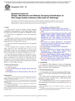 ASTM E747-18 is a standard published by ASTM International. Its full title is "Standard Practice for Design, Manufacture and Material Grouping Classification of Wire Image Quality Indicators (IQI) Used for Radiology". This standard covers: ABSTRACT This practice covers the design, material grouping classification, and manufacture of wire image quality indicators (IQI) used to indicate the quality of radiologic images. This practice, applicable to X-ray and gamma-ray radiology, covers the use of wire penetrameters as the controlling image quality indicator for the material thickness range from 6.4 to 152 mm [0.25 to 6.0 in.]. The alloy group(s) of the material, the thickness or thickness range of the material, and the applicable IQI's that represent the required IQI thickness(s) and alloy(s) shall be considered when selecting IQI's. SCOPE 1.1 This practice2 covers the design, material grouping classification, and manufacture of wire image quality indicators (IQI) used to indicate the quality of radiographic images. 1.2 This practice is applicable to X-ray and gamma-ray radiography. 1.3 This practice covers the use of wire penetrameters as the controlling image quality indicator for the material thickness range from 6.4 to 152 mm (0.25 to 6.0 in.). 1.4 The values stated in inch-pound units are to be regarded as standard. 1.5 This standard does not purport to address all of the safety concerns, if any, associated with its use. It is the responsibility of the user of this standard to establish appropriate safety, health, and environmental practices and determine the applicability of regulatory limitations prior to use. 1.6 This international standard was developed in accordance with internationally recognized principles on standardization established in the Decision on Principles for the Development of International Standards, Guides and Recommendations issued by the World Trade Organization Technical Barriers to Trade (TBT) Committee.