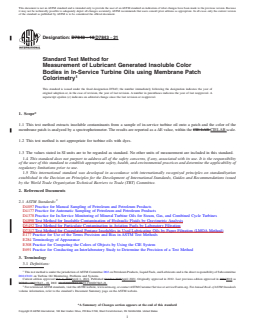 1.1 This test method extracts insoluble contaminants from a sample of in-service turbine oil onto a patch and the color of the membrane patch is analyzed by a spectrophotometer. The results are reported as a ΔE value, within the CIELAB scale.