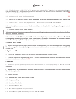 SIGNIFICANCE AND USE 5.1 This test can be a guide to end-users on the formation of lubricant-generated, insoluble deposits. 5.2 The results from this test are intended to be used as a condition monitoring trending tool as part of a comprehensive program, as outlined in standards such as Practice D4378. SCOPE 1.1 This test method extracts insoluble contaminants from a sample of in-service turbine oil onto a patch and the color of the membrane patch is analyzed by a spectrophotometer. The results are reported as a ΔE value, within the CIELAB scale. 1.2 This test method is not appropriate for turbine oils with dyes. 1.3 The values stated in SI units are to be regarded as standard. No other units of measurement are included in this standard. 1.4 This standard does not purport to address all of the safety concerns, if any, associated with its use. It is the responsibility of the user of this standard to establish appropriate safety, health, and environmental practices and determine the applicability of regulatory limitations prior to use. 1.5 This international standard was developed in accordance with internationally recognized principles on standardization established in the Decision on Principles for the Development of International Standards, Guides and Recommendations issued by the World Trade Organization Technical Barriers to Trade (TBT) Committee.