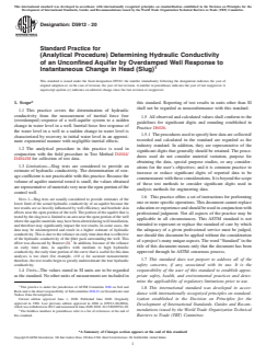 1.1 This practice covers the determination of hydraulic conductivity from the measurement of inertial force free (overdamped) response of a well-aquifer system to a sudden change in water level in a well. Inertial force free response of the water level in a well to a sudden change in water level is characterized by recovery to initial water level in an approximate exponential manner with negligible inertial effects.