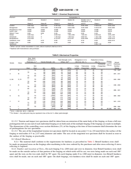 ABSTRACT This specification covers normalized and tempered carbon steel, and liquid quenched and tempered alloy steel forgings for pinions, gears, and shafts for reduction gears. Prior to heat treatment for mechanical properties testing , steel materials may undergo machining and boring, after which specimens shall be stress relieved. Tensile, impact and Brinell hardness tests shall be performed wherein forgings shall conform to the following mechanical properties: tensile strength, yield strength, elongation, reduction of area, Charpy V-notch, and Brinell hardness. Specimens shall also conform to chemical requirements for carbon, manganese, phosphorus, sulfur, silicon, nickel, chromium, molybdenum, vanadium, copper, and aluminum. SCOPE 1.1 This specification covers normalized and tempered carbon steel and quenched and tempered alloy steel forgings for pinions, gears, and shafts. 1.2 Several grades of steel are covered as follows: 1.2.1 Grade 1, Class A, is normalized and tempered carbon steel. 1.2.2 Grade 2, Class B, Grade 3, Class C, Grade 3A, Class D, Grades 4 to 7, Classes E, F, G, and H, Grade 8, Class I, and Grade 9, Class J, are liquid quenched and tempered alloy steel. 1.3 All grades and classes are considered weldable under proper conditions. Welding technique is of fundamental importance and it is presupposed that welding procedure and inspection shall be in accordance with approved methods for the class of material used. 1.4 The values stated in either SI units or inch-pound units are to be regarded separately as standard. The values stated in each system may not be exact equivalents; therefore, each system shall be used independently of the other. Combining values from the two systems may result in non-conformance with the standard. 1.5 This standard does not purport to address all of the safety concerns, if any, associated with its use. It is the responsibility of the user of this standard to establish appropriate safety, health, and environmental practices and determine the applicability of regulatory limitations prior to use. 1.6 This international standard was developed in accordance with internationally recognized principles on standardization established in the Decision on Principles for the Development of International Standards, Guides and Recommendations issued by the World Trade Organization Technical Barriers to Trade (TBT) Committee.