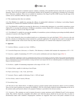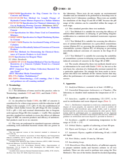 SIGNIFICANCE AND USE 4.1 As described in Guide C1894, the MIC of concrete is considered to be a three-stage process with the reduction in pH (Stage I) (for example, 12.5 > pH > 9-10), the establishment of biofilms which further lowers the pH (Stage II) (for example, 9-10 > pH > 4-6) and eventual deterioration due to biogenic acid exposure (Stage III) (for example, 4.2 The tests are performed in simulated exposure solutions containing well-controlled bacterial strains that are grown in the laboratory. These tests do not require an environmental chamber and are intended to be performed as benchtop tests in biosafety level 1 laboratory conditions. These tests are suitable for simulation of the Stage II and III of MIC because the pH range of the solution can be controlled within the ranges of each stage. 4.3 This standard provides three test methods. 4.3.1 Test Method A is suitable for assessing the efficacy of antimicrobial admixtures in delaying or preventing biogenic acidification in a nutrient-rich simulated wastewater exposure solution. 4.3.2 Test Method B is suitable for assessing the effectiveness of antimicrobial admixtures in a prescribed cementitious system (Option B1) or assessing the performance of different cementitious systems (Option B2) in delaying or preventing microbially-induced corrosion of concrete in the Stage II of MIC. 4.3.3 Test Method C is suitable for assessing the suitability of cementitious systems in delaying or preventing microbially-induced corrosion of concrete in the Stage III of MIC. 4.4 The results obtained by these test methods should serve as information to be used with Guide C1894 in, but not as the sole basis for, selection of a biologically-resistant material for a particular application. No attempt has been made to incorporate into these test methods all the various factors that may affect the performance of a material when subjected to actual service. SCOPE 1.1 This standard presents test methods for the determination of the effects of biogenic acidification on concrete products and/or efficacy of antimicrobial products to resist microbially-induced corrosion (MIC) of concrete. In these tests, the biogenic acidification is achieved by sulfur-oxidizing bacteria (SOB) that can convert elemental sulfur or thiosulfate to sulfuric acid without the use of H2S gas. 1.2 This standard is referenced in the guideline document for MIC of concrete products. Guide C1894 provides guidance for microbially-induced corrosion of concrete products and an overview of where this test, and its options, can and should be used. This document is not intended to be a guideline document for MIC of concrete products. 1.3 This standard does not cover controlled breeding chamber tests, in which H2S gas is produced by bacterial activity and acidification is the result of the conversion of this H2S gas to sulfuric acid. 1.4 This standard does not cover chemical acid immersion tests, in which acidification is achieved by chemical sulfuric acid addition, not by bacterial activity. Testing protocols for chemical acid immersion are described in Test Methods C267 and C1898. 1.5 This standard does not cover tests that assess field exposure conditions or sewage pipe, concrete tank, or concrete riser network design. 1.6 This standard does not cover live trial tests where concrete coupons or other specimens are monitored in sewers. 1.7 The tests described in this standard should not be performed on concrete samples that have already been exposed to MIC conditions. 1.8 This standard does not cover concrete deterioration due to chemical sulfate attack, which is caused by the reaction of sulfate compounds that exist in wastewater with the hydration products of cement. Test methods for assessing sulfate attack are provided by Test Methods C452 and C1012/C1012M. 1.9 The values stated in SI units are to be regarded as standard. No other units of measurement are included in this ...