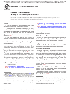 ASTM D2379-09(2023) - Standard Test Method for Acidity of Formaldehyde Solutions outlines a precise procedure for determining the acidity, measured as formic acid content, of commercially available formaldehyde solutions. This method establishes a uniform approach for testing laboratories and manufacturers to assess whether formaldehyde products comply with quality specifications. The standard is developed and maintained by ASTM International and aligns with globally recognized principles for standardization.