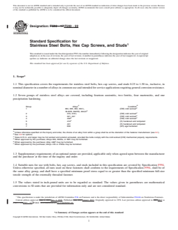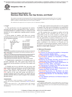 1.1 This specification covers the requirements for stainless steel bolts, hex cap screws, and studs 0.25 to 1.50 in., inclusive, in nominal diameter in a number of alloys in common use and intended for service applications requiring general corrosion resistance.