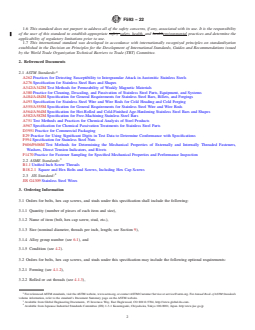 SIGNIFICANCE AND USE 13.1 For the purposes of determining compliance with the specified limits for properties listed in this specification, an observed value or calculated value shall be rounded in accordance with Practice E29. SCOPE 1.1 This specification covers the requirements for stainless steel bolts, hex cap screws, and studs 0.25 to 1.50 in., inclusive, in nominal diameter in a number of alloys in common use and intended for service applications requiring general corrosion resistance. 1.2 Seven groups of stainless steel alloys are covered, including fourteen austenitic, two ferritic, four martensitic, and one precipitation hardening. Group AlloysA ConditionB 1 304, 305, 384, 304 L, (CW) cold workedC 18-9LW, 302HQ, 304J3D 2 316, 316 L (CW) cold workedC 3 321, 347 (CW) cold workedC 4 430E (CW) cold workedC 5 410F (H) hardened and tempered 6 431 (H) hardened and tempered 7 630 (AH) age hardened 1.3 Supplementary requirements of an optional nature are provided, applicable only when agreed upon between the manufacturer and the purchaser at the time of the inquiry and order. 1.4 Suitable nuts for use with bolts, hex cap screws, and studs included in this specification are covered by Specification F594. Unless otherwise specified, all nuts used on these fasteners shall conform to the requirements of Specification F594, shall be of the same alloy group, and shall have a specified minimum proof stress equal to or greater than the specified minimum full-size tensile strength of the externally threaded fastener. 1.5 The values stated in inch-pound units are to be regarded as standard. The values given in parentheses are mathematical conversions to SI units that are provided for information only and are not considered standard. 1.6 This standard does not purport to address all of the safety concerns, if any, associated with its use. It is the responsibility of the user of this standard to establish appropriate safety, health, and environmental practices and determine the applicability of regulatory limitations prior to use. 1.7 This international standard was developed in accordance with internationally recognized principles on standardization established in the Decision on Principles for the Development of International Standards, Guides and Recommendations issued by the World Trade Organization Technical Barriers to Trade (TBT) Committee.
