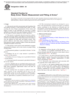 ASTM E3003-20 is a standard published by ASTM International. Its full title is "Standard Practice for Body Armor Wearer Measurement and Fitting of Armor". This standard covers: SIGNIFICANCE AND USE 4.1 Properly sized and fitted body armor enhances the safety and performance of the wearer by providing protection while not restricting movement. Having body armor that fits well begins with appropriate and accurate measurements. The measurement guidance of this practice will facilitate consistency of measurement across the body armor industry and will help wearers understand proper measurements. 4.2 Accurate measurements do not necessarily result in well-fitting armor, so this practice goes a step further by providing a description of well-fitting armor along with a personal armor fit assessment that the wearer can do for himself/herself. 4.3 The measurement and fitting guidance specifically addresses officer-stated requirements for side overlap of front and back body armor panels, minimizing the armhole opening, eliminating any “V” gap (or similar) between the front and back panels, and providing vertical coverage on the front torso from approximately the “2nd uniform shirt button to 2 to 3 finger widths above duty belt.” Those requirements were considered in the development of this practice and the definition of measurements that can be consistently made for any individual. 4.4 This practice describes measurements for the front, back, and sides of the wearer, in addition to girth measurements, to achieve proper sizing of front and back panels and proper fit of the complete armor. 4.5 This practice can be used to train individuals on proper measurement techniques and to train wearers on proper fitting of body armor. SCOPE 1.1 This practice provides measurement and fit guidance for soft ballistic-resistant or stab-resistant body armor, or both, covering the torso. Proper measurement of the wearer and fitting of armor to that individual are necessary to obtain sufficient coverage of the torso and vital organs while allowing the full range of motion required for officer operations. 1.2 This practice is primarily directed toward law enforcement and corrections officers and addresses measurements for and fit of concealable (normal duty) body armor worn under or over the uniform for both male and female wearers. This practice addresses only body armor composed of front and back protective panels contained within a carrier that positions and holds the panels on the torso. 1.3 This practice can be used to train individuals on proper measurement techniques and to train wearers on proper fitting of body armor. 1.4 Measurement guidance is provided in Section 5 of this practice. 1.5 Guidance for use of a tape measure is provided in Section 6 of this practice. 1.6 Guidance for use of sizing vests is provided in Section 7 of this practice. 1.7 A personal armor fit assessment is provided in Section 8 for use by wearers. 1.8 Units—English units are specified in this practice to be consistent with measurement units used in the United States body armor community. Approximate values in SI units are given in parentheses. 1.9 This standard does not purport to address all of the safety concerns, if any, associated with its use. It is the responsibility of the user of this standard to establish appropriate safety, health, and environmental practices and determine the applicability of regulatory limitations prior to use. 1.10 This international standard was developed in accordance with internationally recognized principles on standardization established in the Decision on Principles for the Development of International Standards, Guides and Recommendations issued by the World Trade Organization Technical Barriers to Trade (TBT) Committee.