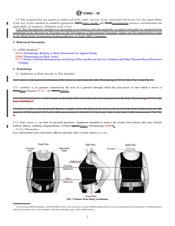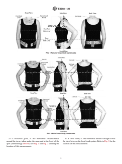 SIGNIFICANCE AND USE 4.1 Properly sized and fitted body armor enhances the safety and performance of the wearer by providing protection while not restricting movement. Having body armor that fits well begins with appropriate and accurate measurements. The measurement guidance of this practice will facilitate consistency of measurement across the body armor industry and will help wearers understand proper measurements. 4.2 Accurate measurements do not necessarily result in well-fitting armor, so this practice goes a step further by providing a description of well-fitting armor along with a personal armor fit assessment that the wearer can do for himself/herself. 4.3 The measurement and fitting guidance specifically addresses officer-stated requirements for side overlap of front and back body armor panels, minimizing the armhole opening, eliminating any “V” gap (or similar) between the front and back panels, and providing vertical coverage on the front torso from approximately the “2nd uniform shirt button to 2 to 3 finger widths above duty belt.” Those requirements were considered in the development of this practice and the definition of measurements that can be consistently made for any individual. 4.4 This practice describes measurements for the front, back, and sides of the wearer, in addition to girth measurements, to achieve proper sizing of front and back panels and proper fit of the complete armor. 4.5 This practice can be used to train individuals on proper measurement techniques and to train wearers on proper fitting of body armor. SCOPE 1.1 This practice provides measurement and fit guidance for soft ballistic-resistant or stab-resistant body armor, or both, covering the torso. Proper measurement of the wearer and fitting of armor to that individual are necessary to obtain sufficient coverage of the torso and vital organs while allowing the full range of motion required for officer operations. 1.2 This practice is primarily directed toward law enforcement and corrections officers and addresses measurements for and fit of concealable (normal duty) body armor worn under or over the uniform for both male and female wearers. This practice addresses only body armor composed of front and back protective panels contained within a carrier that positions and holds the panels on the torso. 1.3 This practice can be used to train individuals on proper measurement techniques and to train wearers on proper fitting of body armor. 1.4 Measurement guidance is provided in Section 5 of this practice. 1.5 Guidance for use of a tape measure is provided in Section 6 of this practice. 1.6 Guidance for use of sizing vests is provided in Section 7 of this practice. 1.7 A personal armor fit assessment is provided in Section 8 for use by wearers. 1.8 Units—English units are specified in this practice to be consistent with measurement units used in the United States body armor community. Approximate values in SI units are given in parentheses. 1.9 This standard does not purport to address all of the safety concerns, if any, associated with its use. It is the responsibility of the user of this standard to establish appropriate safety, health, and environmental practices and determine the applicability of regulatory limitations prior to use. 1.10 This international standard was developed in accordance with internationally recognized principles on standardization established in the Decision on Principles for the Development of International Standards, Guides and Recommendations issued by the World Trade Organization Technical Barriers to Trade (TBT) Committee.