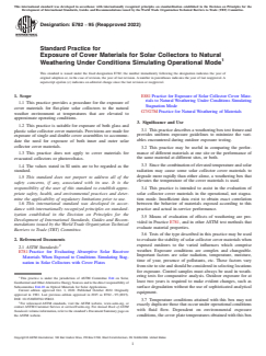 ASTM E782-95(2022) is an internationally recognized standard practice designed for the exposure of cover materials used in flat-plate solar collectors to natural weathering, under conditions that simulate real operational modes. Published by ASTM International, this standard ensures a uniform procedure for subjecting both glass and plastic cover assemblies to the outdoor environment, with conditions that closely reflect the elevated temperatures experienced during typical solar collector operation. The goal is to assess the durability and stability of these cover materials by minimizing variables commonly found in outdoor exposure testing, thus providing a reliable basis for comparing material performance across different sites or configurations.