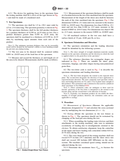 Details the single shear test methodology using a tension testing machine and standardized clevis fixtures, including speed constraints and alignment considerations.Reporting and Reproducibility