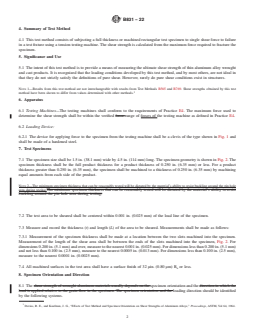 SIGNIFICANCE AND USE 5.1 The intent of this test method is to provide a means of measuring the ultimate shear strength of thin aluminum alloy wrought and cast products. It is recognized that the loading conditions developed by this test method, and by most others, are not ideal in that they do not strictly satisfy the definitions of pure shear. However, rarely do pure shear conditions exist in structures. Note 1: Results from this test method are not interchangeable with results from Test Methods B565 and B769. Shear strengths obtained by this test method have been shown to differ from values determined with other methods.3 SCOPE 1.1 This test method covers single shear testing of thin wrought and cast aluminum alloy products to determine shear ultimate strengths. It is intended for products that are too thin to be tested according to Test Method B769. 1.2 The values stated in inch-pound units are to be regarded as standard. The values given in parentheses are mathematical conversions to SI units that are provided for information only and are not considered standard. 1.3 This standard does not purport to address all of the safety concerns, if any, associated with its use. It is the responsibility of the user of this standard to establish appropriate safety, health, and environmental practices and determine the applicability of regulatory limitations prior to use. 1.4 This international standard was developed in accordance with internationally recognized principles on standardization established in the Decision on Principles for the Development of International Standards, Guides and Recommendations issued by the World Trade Organization Technical Barriers to Trade (TBT) Committee.