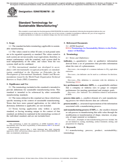 ASTM E2987/E2987M-22 is a standard published by ASTM International. Its full title is "Standard Terminology for Sustainable Manufacturing". This standard covers: SIGNIFICANCE AND USE 2.1 The terminology included in this standard is intended to provide definitions for sustainable manufacturing terms. This standard is intended to be referenced by other sustainable manufacturing standards. 2.2 The terms defined in this standard are those which have specific meaning in the context of sustainable manufacturing. Terms that have more general application, or for which the dictionary definition is applicable, are not included. 2.3 Terms having application only within a specific standard, or having meaning unique to the context of that standard, are defined or explained in the terminology section of the individual standard, and are not included here. SCOPE 1.1 The standard includes terminology applicable to sustainable manufacturing. 1.2 The values stated in either SI units or inch-pound units are to be regarded separately as standard. The values stated in each system are not necessarily exact equivalents; therefore, to ensure conformance with the standard, each system shall be used independently of the other, and values from the two systems shall not be combined. 1.3 This international standard was developed in accordance with internationally recognized principles on standardization established in the Decision on Principles for the Development of International Standards, Guides and Recommendations issued by the World Trade Organization Technical Barriers to Trade (TBT) Committee.