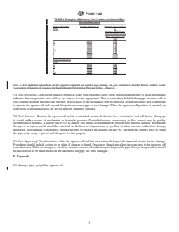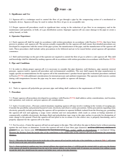 SIGNIFICANCE AND USE 3.1 Squeeze-off is a technique used to control the flow of gas through a pipe by the compressing action of a mechanical or hydraulic device. Squeeze-off may be used to reduce the flow of gas to an acceptable rate. 3.2 Proper squeeze-off procedures result in significant time saving in the reduction of gas flow in an emergency and in the maintenance and operation, or both, of a gas distribution system. Improper squeeze-off can cause damage to the pipe or create a safety hazard, or both. SCOPE 1.1 This guide describes general procedures for squeeze-off of polyolefin gas pressure pipe and tubing. Pipe and squeeze tool manufacturers shall be requested to supply recommendations for squeeze-off with materials or products. 1.2 Governing codes and project specifications should be consulted. Nothing in this document should be construed as recommending practices or systems at variance with governing codes and project specifications. 1.3 This guide covers squeeze-off of polyolefin pipe and tubing in accordance with Specification D2513. 1.4 Where applicable in this guide, “pipe” shall mean “pipe and tubing.” 1.5 Units–The values stated in inch-pound units are to be regarded as the standard. The values given in parentheses are mathematical conversions to SI units, which are provided for information only and are not considered the standard. 1.6 This standard does not purport to address all of the safety concerns, if any, associated with its use. It is the responsibility of the user of this standard to establish appropriate safety, health, and environmental practices and determine the applicability of regulatory limitations prior to use. 1.7 This international standard was developed in accordance with internationally recognized principles on standardization established in the Decision on Principles for the Development of International Standards, Guides and Recommendations issued by the World Trade Organization Technical Barriers to Trade (TBT) Committee.