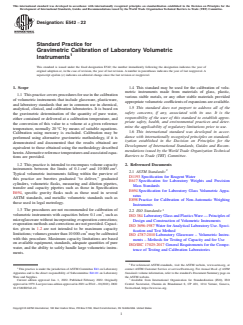 ASTM E542-22, titled Standard Practice for Gravimetric Calibration of Laboratory Volumetric Instruments, provides comprehensive guidelines for the calibration of laboratory volumetric instruments. Issued by ASTM International, this standard specifies gravimetric methods for calibrating measuring devices-such as glassware, plasticware, and certain metallic instruments-commonly used in chemical, analytical, clinical, and calibration laboratories. The calibration process is based on gravimetric determination of the volume of pure water, referenced typically at 20 °C, and is applicable to instruments with capacities ranging from 0.1 cm³ to 10,000 cm³ or greater, provided proper equipment is available.