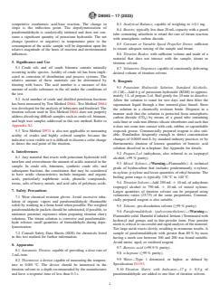 ASTM D8045-17(2023) is a standard published by ASTM International. Its full title is "Standard Test Method for Acid Number of Crude Oils and Petroleum Products by Catalytic Thermometric Titration". This standard covers: SIGNIFICANCE AND USE 5.1 Crude oils and oil sands bitumen contain naturally occurring acidic species. Acidity of crude oil has been implicated in corrosion of distribution and process systems. The relative amount of these materials can be determined by titrating with bases. The acid number is a measure of this amount of acidic substance in the oil under the conditions of the test. 5.2 Acid number of crude and distilled petroleum fractions has been measured by Test Method D664. Test Method D664 was developed for the analysis of lubricants and biodiesel. The titration solvent used in Test Method D664 does not properly address dissolving difficult samples such as crude oil, bitumen, and high wax samples addressed in this test method. Refer to Appendix X1. 5.3 Test Method D974 is also not applicable to measuring acidity of crudes and highly colored samples because the indicator is not visible or it is difficult to discern a color change to detect the end point of the titration. SCOPE 1.1 This test method covers the determination of acidic components in crude oil and petroleum products including waxes, bitumen, base stocks, and asphalts that are soluble in mixtures of xylenes and propan-2-ol. It is applicable for the determination of acids whose dissociation constants in water are larger than 10–9; extremely weak acids whose dissociation constants are smaller than 10–9 do not interfere. The values obtained by this test method may not be numerically equivalent to other acid value measurements. The range of KOH acid numbers included in the precision statement is 0.1 mg/g to 16 mg/g. 1.2 The values stated in SI units are to be regarded as standard. No other units of measurement are included in this standard. 1.3 This standard does not purport to address all of the safety concerns, if any, associated with its use. It is the responsibility of the user of this standard to establish appropriate safety, health, and environmental practices and determine the applicability of regulatory limitations prior to use. Some specific hazards statements are given in Section 7 on Safety Precautions. 1.4 This international standard was developed in accordance with internationally recognized principles on standardization established in the Decision on Principles for the Development of International Standards, Guides and Recommendations issued by the World Trade Organization Technical Barriers to Trade (TBT) Committee.