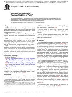 ASTM D1849-95(2019) - Standard Test Method for Package Stability of Paint is an internationally recognized test method developed by ASTM International. This standard specifies procedures for evaluating the package stability of liquid paints, including both solvent-reducible and water-reducible types, when stored above freezing temperatures. The method focuses on assessing changes in paint consistency and the development of defects such as skinning, corrosion, spoilage odors, and physical changes after storage. It is widely used by paint manufacturers, quality assurance professionals, and laboratories to ensure the shelf life and usability of packaged paints.