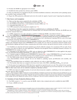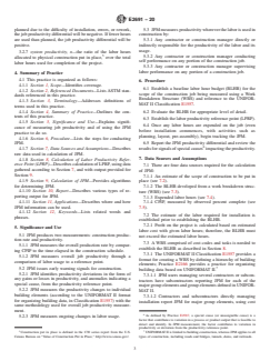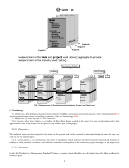 ASTM E2691-20 is a standard published by ASTM International. Its full title is "Standard Practice for Job Productivity Measurement". This standard covers: SIGNIFICANCE AND USE 5.1 JPM produces two measurements: construction production rate and productivity. 5.1.1 JPM measures the overall production rate by comparing CPIP to the time elapsed in the construction schedule. 5.1.2 JPM measures overall job productivity through a comparison of labor usage to a reference point. 5.2 JPM issues early warning signals for construction. 5.2.1 JPM identifies productivity deviations in the form of any gains or losses in productivity, and anomalies indicating a special cause, from the productivity reference point. 5.2.2 JPM measures the productivity changes to individual building elements (according to the UNIFORMAT II format for organizing building data, in Classification E1557) with the same methodology used for overall job productivity measurement. 5.2.3 JPM measures ongoing changes in labor usage. 5.3 JPM measures productivity wherever the labor is used in construction by: 5.3.1 Any contractor or construction manager directly or indirectly responsible for the productivity of the labor and its usage. 5.3.2 Any contractor or construction manager conducting self performance on any portion of the construction job. 5.3.3 Any contractor or construction manager supervising labor performance on any portion of a construction job. SCOPE 1.1 Based on the UNIFORMAT II format for organizing building data, established in Classification E1557, and depending on the level where measurement is applied (industry, total job, or building element), JPM measures construction productivity at three levels: task, project, and industry (shown in Fig. 1). By comparing labor hours used against CPIP, JPM allows for unified measurement of established building elements (according to the UNIFORMAT II format. This practice establishes a process for measuring construction job productivity by comparing labor usage to CPIP. FIG. 1 Measurement of Productivity at the Industry, Project, and Task Level 1.2 JPM measures labor productivity of the installation processes on a construction job.2 1.3 CPIP is measured with input from the labor performing the installation, utilizing elements of statistical process control (SPC) and industrial engineering. 1.4 JPM takes into account the difficulty of installation at any given point on a job. 1.5 JPM evaluates relative productivity changes using trend monitoring. 1.6 This international standard was developed in accordance with internationally recognized principles on standardization established in the Decision on Principles for the Development of International Standards, Guides and Recommendations issued by the World Trade Organization Technical Barriers to Trade (TBT) Committee.