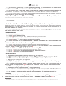 SIGNIFICANCE AND USE 5.1 JPM produces two measurements: construction production rate and productivity. 5.1.1 JPM measures the overall production rate by comparing CPIP to the time elapsed in the construction schedule. 5.1.2 JPM measures overall job productivity through a comparison of labor usage to a reference point. 5.2 JPM issues early warning signals for construction. 5.2.1 JPM identifies productivity deviations in the form of any gains or losses in productivity, and anomalies indicating a special cause, from the productivity reference point. 5.2.2 JPM measures the productivity changes to individual building elements (according to the UNIFORMAT II format for organizing building data, in Classification E1557) with the same methodology used for overall job productivity measurement. 5.2.3 JPM measures ongoing changes in labor usage. 5.3 JPM measures productivity wherever the labor is used in construction by: 5.3.1 Any contractor or construction manager directly or indirectly responsible for the productivity of the labor and its usage. 5.3.2 Any contractor or construction manager conducting self performance on any portion of the construction job. 5.3.3 Any contractor or construction manager supervising labor performance on any portion of a construction job. SCOPE 1.1 Based on the UNIFORMAT II format for organizing building data, established in Classification E1557, and depending on the level where measurement is applied (industry, total job, or building element), JPM measures construction productivity at three levels: task, project, and industry (shown in Fig. 1). By comparing labor hours used against CPIP, JPM allows for unified measurement of established building elements (according to the UNIFORMAT II format. This practice establishes a process for measuring construction job productivity by comparing labor usage to CPIP. FIG. 1 Measurement of Productivity at the Industry, Project, and Task Level 1.2 JPM measures labor productivity of the installation processes on a construction job.2 1.3 CPIP is measured with input from the labor performing the installation, utilizing elements of statistical process control (SPC) and industrial engineering. 1.4 JPM takes into account the difficulty of installation at any given point on a job. 1.5 JPM evaluates relative productivity changes using trend monitoring. 1.6 This international standard was developed in accordance with internationally recognized principles on standardization established in the Decision on Principles for the Development of International Standards, Guides and Recommendations issued by the World Trade Organization Technical Barriers to Trade (TBT) Committee.