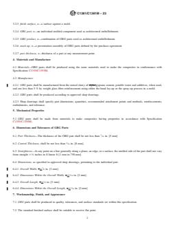 ABSTRACT This specification covers molded glass fiber reinforced gypsum (GRG) parts, which are nonload-bearing, thin-shell, ornamental shapes for architectural embellishment of interior building construction. GRG parts shall be produced using the same materials used to make the composites in conformance with the referenced specification. GRG parts shall be manufactured from the mixed slurry or alpha gypsum cement, potable water and additives, and glass fiber reinforcement using either the hand lay-up or the spray-up process in a mold. GRG parts shall be produced according to approved shop drawings. Shop drawings shall specify part dimensions, quantities, recommended attachment points and methods, reinforcements, embedments, and tolerance. The material shall conform to the required mechanical properties and to the specified dimensions and tolerances of GRG parts. SCOPE 1.1 This specification covers molded glass fiber reinforced gypsum (GRG) parts, which are nonload-bearing, thin-shell, ornamental shapes for architectural embellishment of interior building construction. 1.2 The values stated in either SI units or inch-pound units are to be regarded separately as standard. Within the text, the SI units are shown in brackets. The values stated in each system may not be exact equivalents; therefore, each system shall be used independently of the other. Combining values from the two systems may result in non-conformance with the standard. 1.3 The information presented refers to the molded surface of the part. 1.4 The text of this standard references footnotes, which provide explanatory material. These footnotes shall not be considered as requirements of the standard. 1.5 This international standard was developed in accordance with internationally recognized principles on standardization established in the Decision on Principles for the Development of International Standards, Guides and Recommendations issued by the World Trade Organization Technical Barriers to Trade (TBT) Committee.