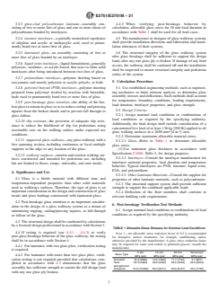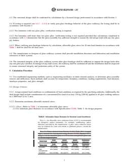 SIGNIFICANCE AND USE 4.1 Glass is a brittle material with different time and temperature-dependent properties than other solid materials used as walkways surfaces. Therefore, the type of glass is an important consideration in the design and construction of glass treads and glass landings constructed with laminated glass. 4.2 Post-breakage glass retention is an important consideration in the design of a glass walkway system as a means of minimizing tripping, cutting/piercing injuries, or fall-through or fallout of the glass. 4.3 The structural design shall be confirmed by calculations by a licensed design professional in accordance with Section 5. 4.4 If testing is required (see 4.4.1 – 4.4.3) to verify post-glass breakage behavior of the glass walkway, the testing shall be in accordance with Section 6. 4.4.1 For laminates with two glass plies, verification testing is required. 4.4.2 For laminates with more than two glass plies, verification testing is not required provided that calculations completed in accordance with 4.3 demonstrate that the glass assembly has sufficient strength to sustain the full design load with any one glass ply broken. 4.4.3 When verifying post-breakage behavior by calculation, allowable glass stress for 10 min load duration in accordance with Table 1 shall be used for all load cases. 4.5 The manufacturer or designer of glass walkway systems shall provide installation directions and fabrication and installation tolerances of their systems. 4.6 The structural integrity of the glass walkway system after glass breakage shall be sufficient to support the design loads after any one glass ply is broken. If damage of any kind occurs, the walkway shall be cordoned off and the installation shall be inspected to ensure structural integrity and pedestrian safety of the system. SCOPE 1.1 This practice addresses elements related to load-bearing glass walkways, glass treads, and glass landings constructed with laminated glass. This standard includes performance, design, and safe behavior considerations. It addresses the characteristics unique to glass and laminated glass. Issues that are common to all walkways, such as slip resistance, are addressed in existing referenced standards. 1.2 This practice does not address glass walkways constructed with monolithic glass, glass block, insulating glass units, glass tiles that are directly bonded to a non-glass structural substrate, or glass walkways intended to support vehicular traffic. 1.3 The values stated in either SI units or inch-pound units are to be regarded separately as standard. The values stated in each system are not necessarily exact equivalents; therefore, to ensure conformance with the standard, each system shall be used independently of the other, and values from the two systems shall not be combined. 1.4 This standard does not purport to address all of the safety concerns, if any, associated with its use. It is the responsibility of the user of this standard to establish appropriate safety, health, and environmental practices and determine the applicability of regulatory limitations prior to use. 1.5 This international standard was developed in accordance with internationally recognized principles on standardization established in the Decision on Principles for the Development of International Standards, Guides and Recommendations issued by the World Trade Organization Technical Barriers to Trade (TBT) Committee.