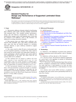 ASTM E2751/E2751M-21 is a standard published by ASTM International. Its full title is "Standard Practice for Design and Performance of Supported Laminated Glass Walkways". This standard covers: SIGNIFICANCE AND USE 4.1 Glass is a brittle material with different time and temperature-dependent properties than other solid materials used as walkways surfaces. Therefore, the type of glass is an important consideration in the design and construction of glass treads and glass landings constructed with laminated glass. 4.2 Post-breakage glass retention is an important consideration in the design of a glass walkway system as a means of minimizing tripping, cutting/piercing injuries, or fall-through or fallout of the glass. 4.3 The structural design shall be confirmed by calculations by a licensed design professional in accordance with Section 5. 4.4 If testing is required (see 4.4.1 – 4.4.3) to verify post-glass breakage behavior of the glass walkway, the testing shall be in accordance with Section 6. 4.4.1 For laminates with two glass plies, verification testing is required. 4.4.2 For laminates with more than two glass plies, verification testing is not required provided that calculations completed in accordance with 4.3 demonstrate that the glass assembly has sufficient strength to sustain the full design load with any one glass ply broken. 4.4.3 When verifying post-breakage behavior by calculation, allowable glass stress for 10 min load duration in accordance with Table 1 shall be used for all load cases. 4.5 The manufacturer or designer of glass walkway systems shall provide installation directions and fabrication and installation tolerances of their systems. 4.6 The structural integrity of the glass walkway system after glass breakage shall be sufficient to support the design loads after any one glass ply is broken. If damage of any kind occurs, the walkway shall be cordoned off and the installation shall be inspected to ensure structural integrity and pedestrian safety of the system. SCOPE 1.1 This practice addresses elements related to load-bearing glass walkways, glass treads, and glass landings constructed with laminated glass. This standard includes performance, design, and safe behavior considerations. It addresses the characteristics unique to glass and laminated glass. Issues that are common to all walkways, such as slip resistance, are addressed in existing referenced standards. 1.2 This practice does not address glass walkways constructed with monolithic glass, glass block, insulating glass units, glass tiles that are directly bonded to a non-glass structural substrate, or glass walkways intended to support vehicular traffic. 1.3 The values stated in either SI units or inch-pound units are to be regarded separately as standard. The values stated in each system are not necessarily exact equivalents; therefore, to ensure conformance with the standard, each system shall be used independently of the other, and values from the two systems shall not be combined. 1.4 This standard does not purport to address all of the safety concerns, if any, associated with its use. It is the responsibility of the user of this standard to establish appropriate safety, health, and environmental practices and determine the applicability of regulatory limitations prior to use. 1.5 This international standard was developed in accordance with internationally recognized principles on standardization established in the Decision on Principles for the Development of International Standards, Guides and Recommendations issued by the World Trade Organization Technical Barriers to Trade (TBT) Committee.