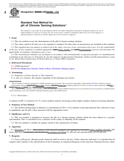 SIGNIFICANCE AND USE 5.1 This test method is designed to measure the pH of a chrome tanning solution which has been diluted to a specific concentration. This is considered to be a measure of the acidity or alkalinity of the solution. 5.2 This test method is suitable for quality control in the manufacture of leather. SCOPE 1.1 This test method covers the determination of the pH of chrome tanning solutions. 1.2 The values stated in SI units are to be regarded as standard. No other units of measurement are included in this standard. 1.3 This standard does not purport to address all of the safety concerns, if any, associated with its use. It is the responsibility of the user of this standard to establish appropriate safety, health, and environmental practices and determine the applicability of regulatory limitations prior to use. 1.4 This international standard was developed in accordance with internationally recognized principles on standardization established in the Decision on Principles for the Development of International Standards, Guides and Recommendations issued by the World Trade Organization Technical Barriers to Trade (TBT) Committee.