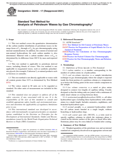 ASTM D5442-17(2021) is a standard published by ASTM International. Its full title is "Standard Test Method for Analysis of Petroleum Waxes by Gas Chromatography". This standard covers: SIGNIFICANCE AND USE 5.1 The determination of the carbon number distribution of petroleum waxes and the normal and non-normal hydrocarbons in each can be used for control of production processes as well as a guide to performance in many end uses. 5.2 Data resulting from this test method are particularly useful in evaluating petroleum waxes for use in rubber formulations. SCOPE 1.1 This test method covers the quantitative determination of the carbon number distribution of petroleum waxes in the range from n-C17 through n-C44 by gas chromatography using internal standardization. In addition, the content of normal and non-normal hydrocarbons for each carbon number is also determined. Material with a carbon number above n-C44 is determined by its difference from 100 % by mass and reported as C45+. 1.2 This test method is applicable to petroleum derived waxes, including blends of waxes. This test method is not applicable to oxygenated waxes, such as synthetic polyethylene glycols (for example, Carbowax2), or natural products such as beeswax or carnauba. 1.3 This test method is not directly applicable to waxes with oil content greater than 10 % as determined by Test Method D721. 1.4 The values stated in SI units are to be regarded as standard. No other units of measurement are included in this standard. 1.5 This standard does not purport to address all of the safety concerns, if any, associated with its use. It is the responsibility of the user of this standard to consult and establish appropriate safety, health, and environmental practices and determine the applicability of regulatory limitations prior to use. 1.6 This international standard was developed in accordance with internationally recognized principles on standardization established in the Decision on Principles for the Development of International Standards, Guides and Recommendations issued by the World Trade Organization Technical Barriers to Trade (TBT) Committee.
