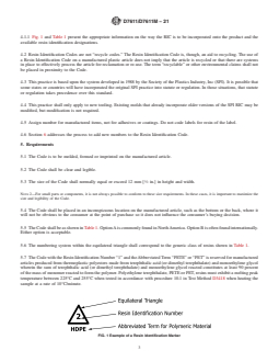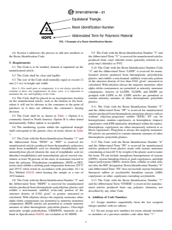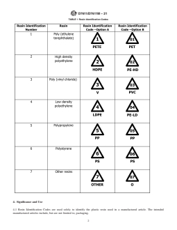 SIGNIFICANCE AND USE 4.1 Resin Identification Codes are used solely to identify the plastic resin used in a manufactured article. The intended manufactured articles include, but are not limited to, packaging. 4.1.1 Fig. 1 and Table 1 present the appropriate information on the way the RIC is to be incorporated onto the product and the available resin identification designations. FIG. 1 Example of a Resin Identification Marker 4.2 Resin Identification Codes are not “recycle codes.” The Resin Identification Code is, though, an aid to recycling. The use of a Resin Identification Code on a manufactured plastic article does not imply that the article is recycled or that there are systems in place to effectively process the article for reclamation or re-use. The term “recyclable” or other environmental claims shall not be placed in proximity to the Code. 4.3 This practice is based upon the system developed in 1988 by the Society of the Plastics Industry, Inc (SPI). It is possible that some states or countries will have incorporated the original SPI practice into statute or regulation. In those situations, that statute or regulation takes precedence over this standard. 4.4 This practice shall only apply to new tooling. Existing molds that already incorporate older versions of the SPI RIC may be modified, but modification is not required. 4.5 Assign number for manufactured items, not for adhesives or coatings. Do not code labels for resin of the label. 4.6 Section 6 addresses the process to add new numbers to the Resin Identification Code. SCOPE 1.1 This practice stipulates the types, names, and sizes of Codes for those material types specified in Table 1. 1.2 The values stated in either SI units or inch-pound units are to be regarded separately as standard. The values stated in each system are likely not to be exact equivalents; therefore, each system shall be used independently of the other. Combining values from the two systems is likely to result in non-conformance with the standard. 1.3 This standard does not purport to address all of the safety concerns, if any, associated with its use. It is the responsibility of the user of this standard to establish appropriate safety, health, and environmental practices and determine the applicability of regulatory limitations prior to use. Note 1: There is no known ISO equivalent to this standard. 1.4 This international standard was developed in accordance with internationally recognized principles on standardization established in the Decision on Principles for the Development of International Standards, Guides and Recommendations issued by the World Trade Organization Technical Barriers to Trade (TBT) Committee.