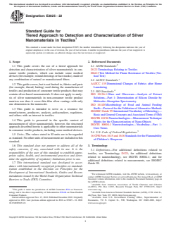 ASTM E3025-22 is a guide published by ASTM International. Its full title is "Standard Guide for Tiered Approach to Detection and Characterization of Silver Nanomaterials in Textiles". This standard covers: SIGNIFICANCE AND USE 4.1 Natural and manufactured textiles fibers can be treated with chemicals to provide enhanced antimicrobial (fungi, bacteria, viruses) properties. In some cases, silver nanomaterials may be used to treat textile fibers (1).6 Silver nanomaterials are used to treat a wide array of consumer textile products, including, but not limited to, various clothing; primary garments (shirts, pants), outer wear (gloves, jackets), inner wear (socks and underwear), children’s clothing (sleepwear); children’s plush toys; bath towels and bedding (sheets, pillows); and medical devices (for example, wound dressings and face masks) (2). 4.2 There are many different chemical and physical forms of silver that are used to treat textiles and an overview of this topic is provided in Appendix X1. 4.3 Several applicable techniques for detection and characterization of silver are listed and described in Appendix X2 so that users of this guide may understand the suitability of a particular technique for their specific textile and silver measurement need. 4.4 There are many different reasons to assay for silver nanomaterials in a textile at any point in a product’s life cycle. For example, a producer may want to verify that a textile meets their internal quality control specifications or a regulator may want to understand the properties of silver nanomaterials used to make a consumer textile product under their jurisdiction or what quantity of silver nanomaterial is potentially available for release from the treated textile during the washing process or during product use. Regardless of the specific reason, a structured approach to detect and characterize silver nanomaterials present in a textile will facilitate measurements and data comparison. Detection and characterterization of silver in textiles is one component of an overall risk assessment. 4.5 The approach presented in this guide (see Fig. 1) consists of three sequential tiers: obtain a textile sample (Section 7), detection o... SCOPE 1.1 This guide covers the use of a tiered approach for detection and characterization of silver nanomaterials in consumer textile products, which can include some medical devices (for example, wound dressings or face masks), made of any combination of natural or manufactured fibers. 1.2 This guide covers, but is not limited to, fabrics and parts (for example, thread, batting) used during the manufacture of textiles and production of consumer textile products that may contain silver-based nanomaterials. It does not apply to analysis of silver nanomaterials in non-consumer textile product matrices nor does it cover thin film silver coatings with only one dimension in the nanoscale. 1.3 This guide is intended to serve as a resource for manufacturers, producers, analysts, policymakers, regulators, and others with an interest in textiles. 1.4 This guide is presented in the specific context of measurement of silver nanomaterials; however, the structured approach described herein is applicable to other nanomaterials in consumer textile products, including some medical devices. 1.5 Units—The values stated in SI units are to be regarded as standard. No other units of measurement are included in this standard. 1.6 This standard does not purport to address all of the safety concerns, if any, associated with its use. It is the responsibility of the user of this standard to establish appropriate safety, health, and environmental practices and determine the applicability of regulatory limitations prior to use. 1.7 This international standard was developed in accordance with internationally recognized principles on standardization established in the Decision on Principles for the Development of International Standards, Guides and Recommendations issued by the World Trade Organization Technical Barriers to Trade (TBT) Committee.