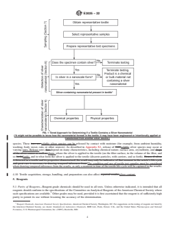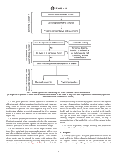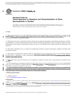 SIGNIFICANCE AND USE 4.1 Natural and manufactured textiles fibers can be treated with chemicals to provide enhanced antimicrobial (fungi, bacteria, viruses) properties. In some cases, silver nanomaterials may be used to treat textile fibers (1).6 Silver nanomaterials are used to treat a wide array of consumer textile products, including, but not limited to, various clothing; primary garments (shirts, pants), outer wear (gloves, jackets), inner wear (socks and underwear), children’s clothing (sleepwear); children’s plush toys; bath towels and bedding (sheets, pillows); and medical devices (for example, wound dressings and face masks) (2). 4.2 There are many different chemical and physical forms of silver that are used to treat textiles and an overview of this topic is provided in Appendix X1. 4.3 Several applicable techniques for detection and characterization of silver are listed and described in Appendix X2 so that users of this guide may understand the suitability of a particular technique for their specific textile and silver measurement need. 4.4 There are many different reasons to assay for silver nanomaterials in a textile at any point in a product’s life cycle. For example, a producer may want to verify that a textile meets their internal quality control specifications or a regulator may want to understand the properties of silver nanomaterials used to make a consumer textile product under their jurisdiction or what quantity of silver nanomaterial is potentially available for release from the treated textile during the washing process or during product use. Regardless of the specific reason, a structured approach to detect and characterize silver nanomaterials present in a textile will facilitate measurements and data comparison. Detection and characterterization of silver in textiles is one component of an overall risk assessment. 4.5 The approach presented in this guide (see Fig. 1) consists of three sequential tiers: obtain a textile sample (Section 7), detection o... SCOPE 1.1 This guide covers the use of a tiered approach for detection and characterization of silver nanomaterials in consumer textile products, which can include some medical devices (for example, wound dressings or face masks), made of any combination of natural or manufactured fibers. 1.2 This guide covers, but is not limited to, fabrics and parts (for example, thread, batting) used during the manufacture of textiles and production of consumer textile products that may contain silver-based nanomaterials. It does not apply to analysis of silver nanomaterials in non-consumer textile product matrices nor does it cover thin film silver coatings with only one dimension in the nanoscale. 1.3 This guide is intended to serve as a resource for manufacturers, producers, analysts, policymakers, regulators, and others with an interest in textiles. 1.4 This guide is presented in the specific context of measurement of silver nanomaterials; however, the structured approach described herein is applicable to other nanomaterials in consumer textile products, including some medical devices. 1.5 Units—The values stated in SI units are to be regarded as standard. No other units of measurement are included in this standard. 1.6 This standard does not purport to address all of the safety concerns, if any, associated with its use. It is the responsibility of the user of this standard to establish appropriate safety, health, and environmental practices and determine the applicability of regulatory limitations prior to use. 1.7 This international standard was developed in accordance with internationally recognized principles on standardization established in the Decision on Principles for the Development of International Standards, Guides and Recommendations issued by the World Trade Organization Technical Barriers to Trade (TBT) Committee.