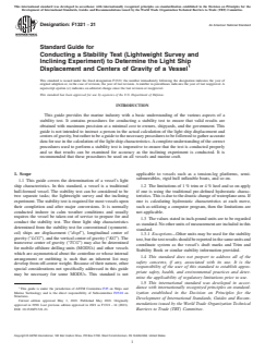 ASTM F1321-21 is a guide published by ASTM International. Its full title is "Standard Guide for Conducting a Stability Test (Lightweight Survey and Inclining Experiment) to Determine the Light Ship Displacement and Centers of Gravity of a Vessel". This standard covers: SIGNIFICANCE AND USE 4.1 From the light ship characteristics one is able to calculate the stability characteristics of the vessel for all conditions of loading and thereby determine whether the vessel satisfies the applicable stability criteria. Accurate results from a stability test may in some cases determine the future survival of the vessel and its crew, so the accuracy with which the test is conducted cannot be overemphasized. The condition of the vessel and the environment during the test is rarely ideal and consequently, the stability test is infrequently conducted exactly as planned. If the vessel is not 100 % complete and the weather is not perfect, there ends up being water or shipyard trash in a tank that was supposed to be clean and dry and so forth, then the person in charge must make immediate decisions as to the acceptability of variances from the plan. A complete understanding of the principles behind the stability test and a knowledge of the factors that affect the results is necessary. SCOPE 1.1 This guide covers the determination of a vessel’s light ship characteristics. In this standard, a vessel is a traditional hull-formed vessel. The stability test can be considered to be two separate tasks; the lightweight survey and the inclining experiment. The stability test is required for most vessels upon their completion and after major conversions. It is normally conducted inshore in calm weather conditions and usually requires the vessel be taken out of service to prepare for and conduct the stability test. The three light ship characteristics determined from the stability test for conventional (symmetrical) ships are displacement (“displ”), longitudinal center of gravity (“LCG”), and the vertical center of gravity (“KG”). The transverse center of gravity (“TCG”) may also be determined for mobile offshore drilling units (MODUs) and other vessels which are asymmetrical about the centerline or whose internal arrangement or outfitting is such that an inherent list may develop from off-center weight. Because of their nature, other special considerations not specifically addressed in this guide may be necessary for some MODUs. This standard is not applicable to vessels such as a tension-leg platforms, semi-submersibles, rigid hull inflatable boats, and so on. 1.2 The limitations of 1 % trim or 4 % heel and so on apply if one is using the traditional pre-defined hydrostatic characteristics. This is due to the drastic change of waterplane area. If one is calculating hydrostatic characteristics at each move, such as utilizing a computer program, then the limitations are not applicable. 1.3 The values stated in inch-pound units are to be regarded as standard. No other units of measurement are included in this standard. 1.3.1 Exceptions—Other units may be used for the stability test, but the test results should be reported in the same units and coordinate system as the vessel’s draft marks and Trim and Stability Book or similar stability information provided. 1.4 This standard does not purport to address all of the safety concerns, if any, associated with its use. It is the responsibility of the user of this standard to establish appropriate safety, health, and environmental practices and determine the applicability of regulatory limitations prior to use. 1.5 This international standard was developed in accordance with internationally recognized principles on standardization established in the Decision on Principles for the Development of International Standards, Guides and Recommendations issued by the World Trade Organization Technical Barriers to Trade (TBT) Committee.
