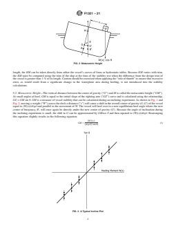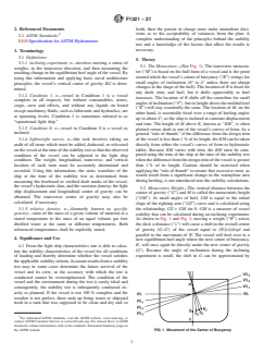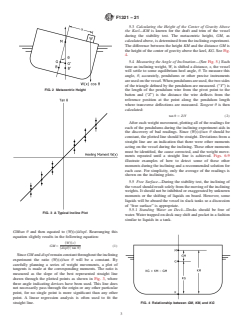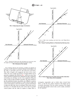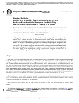 SIGNIFICANCE AND USE 4.1 From the light ship characteristics one is able to calculate the stability characteristics of the vessel for all conditions of loading and thereby determine whether the vessel satisfies the applicable stability criteria. Accurate results from a stability test may in some cases determine the future survival of the vessel and its crew, so the accuracy with which the test is conducted cannot be overemphasized. The condition of the vessel and the environment during the test is rarely ideal and consequently, the stability test is infrequently conducted exactly as planned. If the vessel is not 100 % complete and the weather is not perfect, there ends up being water or shipyard trash in a tank that was supposed to be clean and dry and so forth, then the person in charge must make immediate decisions as to the acceptability of variances from the plan. A complete understanding of the principles behind the stability test and a knowledge of the factors that affect the results is necessary. SCOPE 1.1 This guide covers the determination of a vessel’s light ship characteristics. In this standard, a vessel is a traditional hull-formed vessel. The stability test can be considered to be two separate tasks; the lightweight survey and the inclining experiment. The stability test is required for most vessels upon their completion and after major conversions. It is normally conducted inshore in calm weather conditions and usually requires the vessel be taken out of service to prepare for and conduct the stability test. The three light ship characteristics determined from the stability test for conventional (symmetrical) ships are displacement (“displ”), longitudinal center of gravity (“LCG”), and the vertical center of gravity (“KG”). The transverse center of gravity (“TCG”) may also be determined for mobile offshore drilling units (MODUs) and other vessels which are asymmetrical about the centerline or whose internal arrangement or outfitting is such that an inherent list may develop from off-center weight. Because of their nature, other special considerations not specifically addressed in this guide may be necessary for some MODUs. This standard is not applicable to vessels such as a tension-leg platforms, semi-submersibles, rigid hull inflatable boats, and so on. 1.2 The limitations of 1 % trim or 4 % heel and so on apply if one is using the traditional pre-defined hydrostatic characteristics. This is due to the drastic change of waterplane area. If one is calculating hydrostatic characteristics at each move, such as utilizing a computer program, then the limitations are not applicable. 1.3 The values stated in inch-pound units are to be regarded as standard. No other units of measurement are included in this standard. 1.3.1 Exceptions—Other units may be used for the stability test, but the test results should be reported in the same units and coordinate system as the vessel’s draft marks and Trim and Stability Book or similar stability information provided. 1.4 This standard does not purport to address all of the safety concerns, if any, associated with its use. It is the responsibility of the user of this standard to establish appropriate safety, health, and environmental practices and determine the applicability of regulatory limitations prior to use. 1.5 This international standard was developed in accordance with internationally recognized principles on standardization established in the Decision on Principles for the Development of International Standards, Guides and Recommendations issued by the World Trade Organization Technical Barriers to Trade (TBT) Committee.